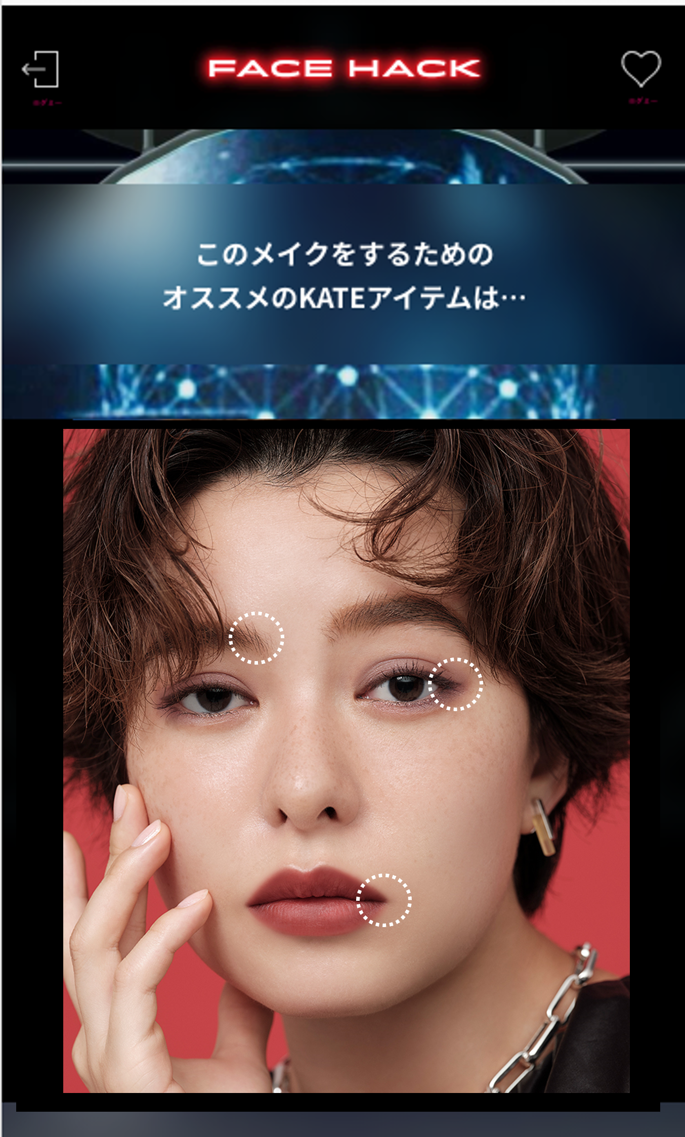 昨年2月に公開し大人気を博した、KATE独自のメイクメソッドを習得できる「KATE SCAN」が『KATE ZONE』でも楽しめます。カメラで顔をスキャンし、AIが顔の特徴点を84座標から測定し、目や鼻の位置、各パーツの幅の比率や顔の輪郭などから顔の特徴を分析し、KATE独自のスコアリングによりオリジナルの顔タイプに分類。タイプごとにその人に合ったオリジナルメイクメソッドを提案します。