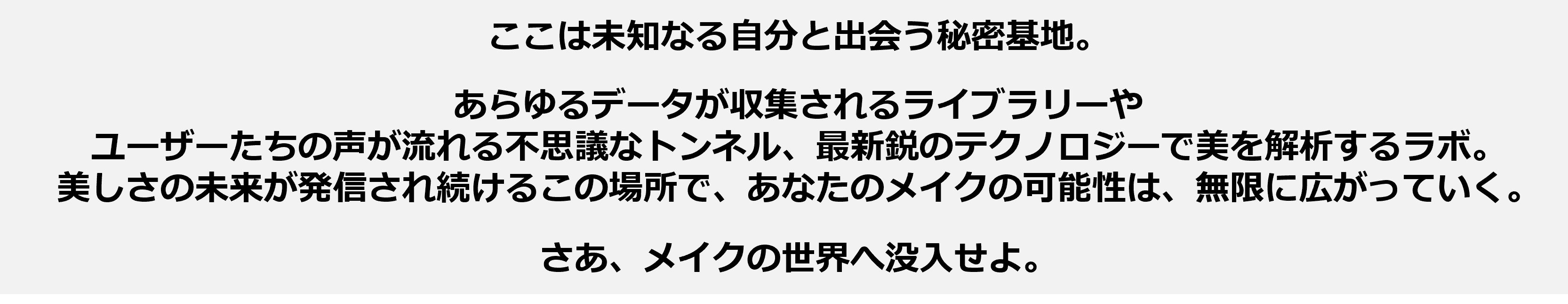 空間のコンセプトは「秘密基地」。遠くに見える都市を背景とした何もないはずの大地に、光を放つ不思議な建築物。その中では、メイクにまつわるあらゆるデータ、ユーザーたちのリアルな声、さまざまなテクノロジーによって、新しい自分に出会える体験ができます。