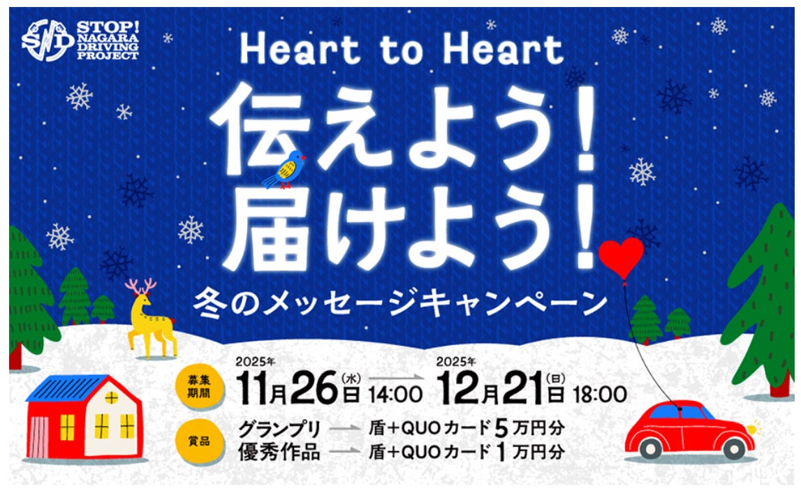 NEXCO西日本、阪神高速、JB本四高速、FM大阪の4社が進める高速道路での交通事故をゼロにするための危険運転撲滅プロジェクト「STOP! NAGARA DRIVING PROJECT(通称:SNDプロジェクト)」において、「Heart to Heart 伝えよう!届けよう!冬のSNDメッセージキャンペーン」を開催します。
