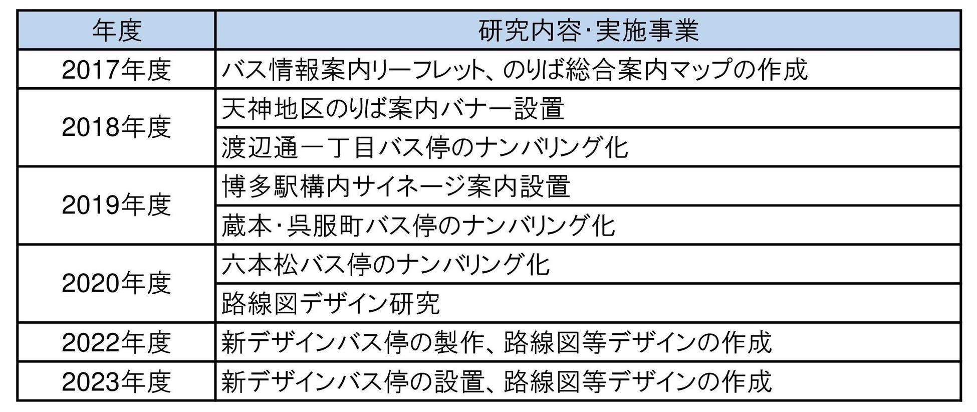 サインデザインの知見を豊富に有する九州大学大学院芸術工学研究院と西日本鉄道㈱が共同で、分かりやすいバス停や路線図、バス案内情報を研究し、ユーザーエクスペリエンス(UX)向上に 繋げることを目的に実施。