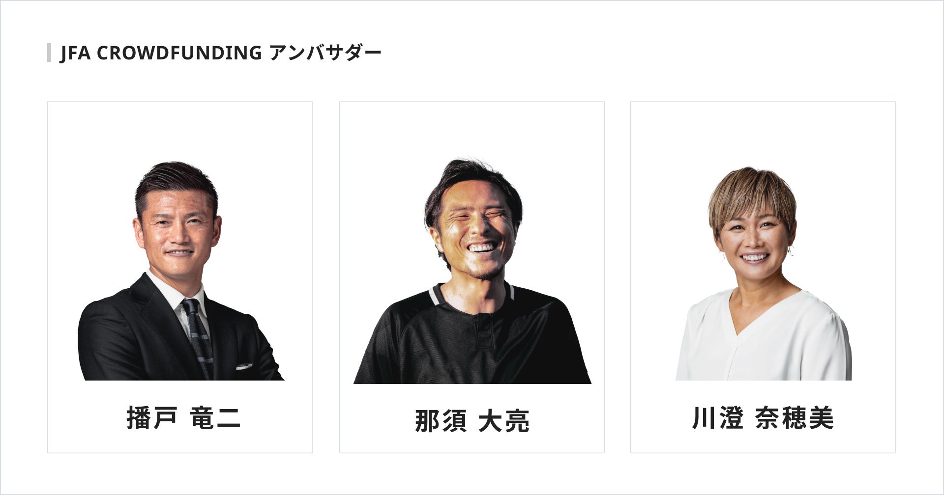 「JFAクラウドファンディングは、サッカーに関わるさまざまな人々の夢や挑戦をみんなでサポートする取り組みです。サッカーにも夢にも共に支えある仲間が必要です。サッカーには人々を結びつけ、夢を現実に変えられる力があります。クラウドファンディングは人と人とをつないでみんなで挑戦をして夢を実現させるものです。たくさんの人の支援や想いが、地域やクラブ、部活や選手、子どもや大人、それぞれの挑戦を後押しします。たくさんの人が夢を持ち、その夢を追いかける力を手に入れることで、未来のサッカー界がより素晴らしいものになるように一緒に応援しましょう!たくさんの人がつながり、みんなで新しいサッカー界をつくっていきましょう」