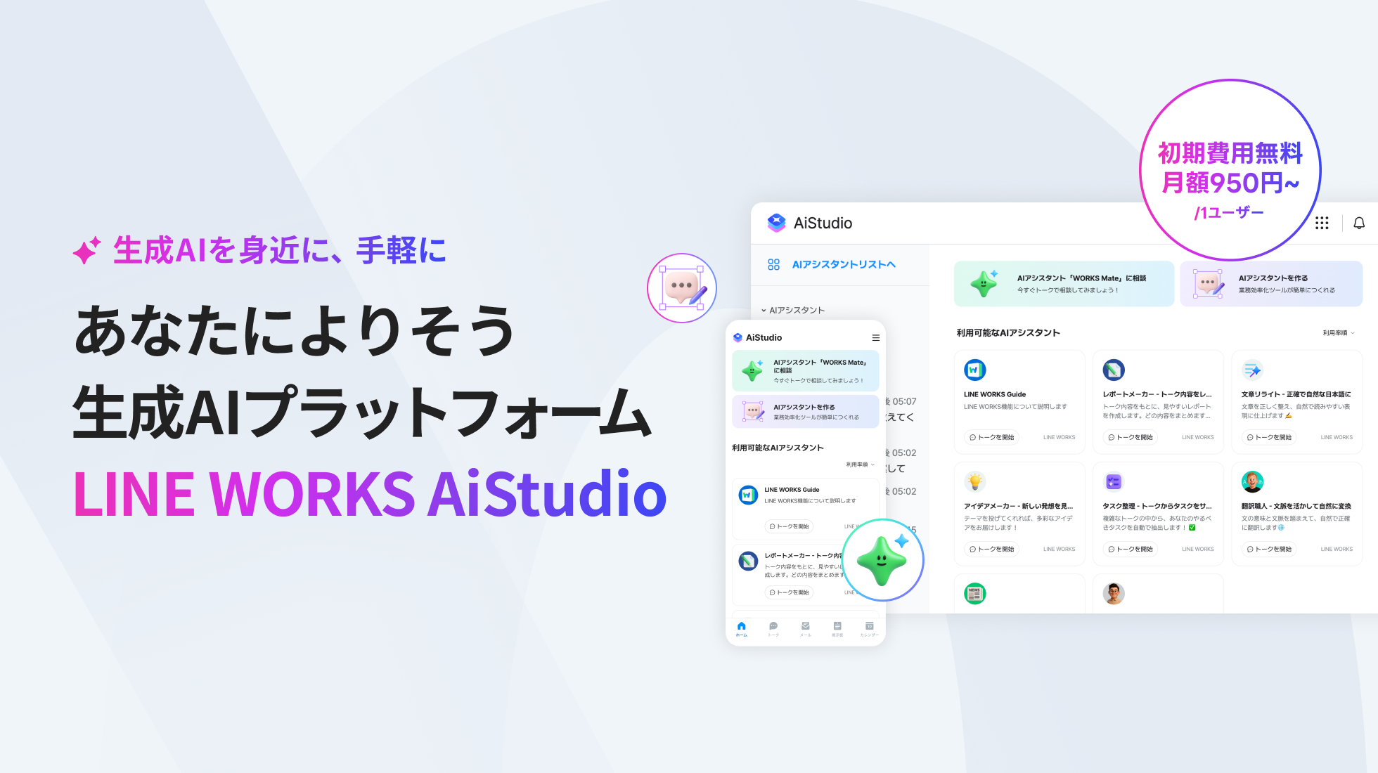ビジネスコミュニケーションツール「LINE WORKS」および各種AI製品を提供するLINE WORKS株式会社(本社:東京都渋谷区、代表取締役社長:島岡 岳史)は本日、生成AIを身近で安全に活用できる新サービス「LINE WORKS AiStudio(ラインワークス エーアイスタジオ)」の提供を開始しました。