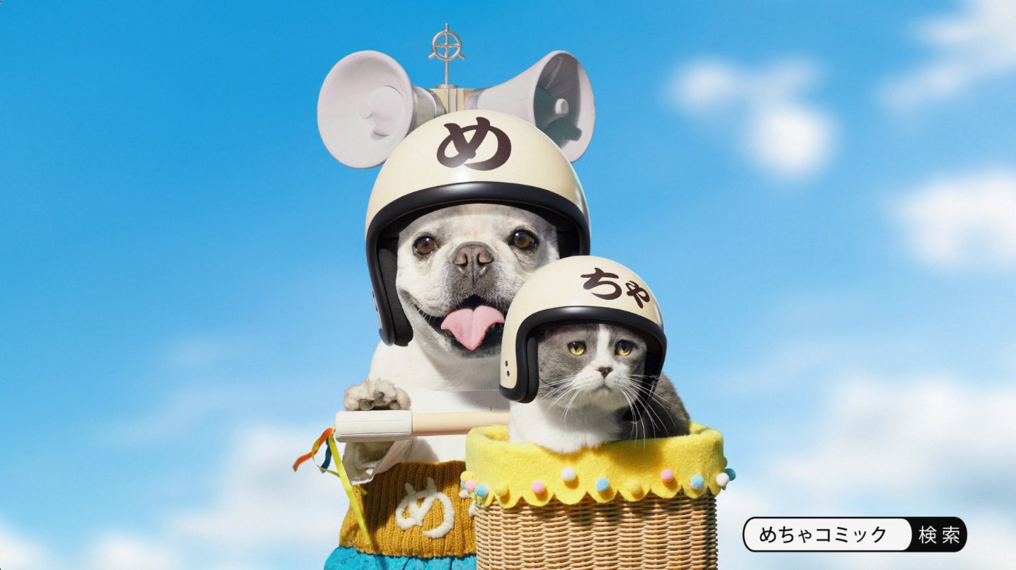 今回の「ドローン篇」、「無料コミック篇」は、めちゃ犬とちゃめ(猫)が空からドローンに乗って登場!人々の注目を集めながら街を飛ぶドローン。そのスピーカーからは何やら聞き覚えのある声が……。ドローンを操っていたのはやはりあの人だった!?