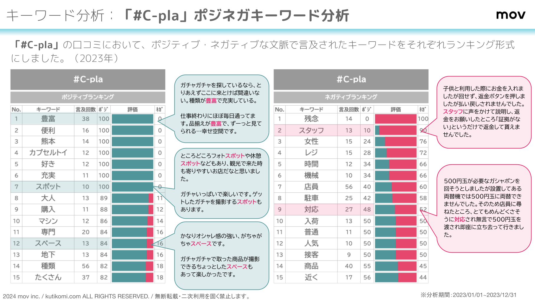 「#C-pla」の口コミにおいて、ポジティブ・ネガティブな文脈で言及されたキーワードをそれぞれランキング形式にしました。(2023年)