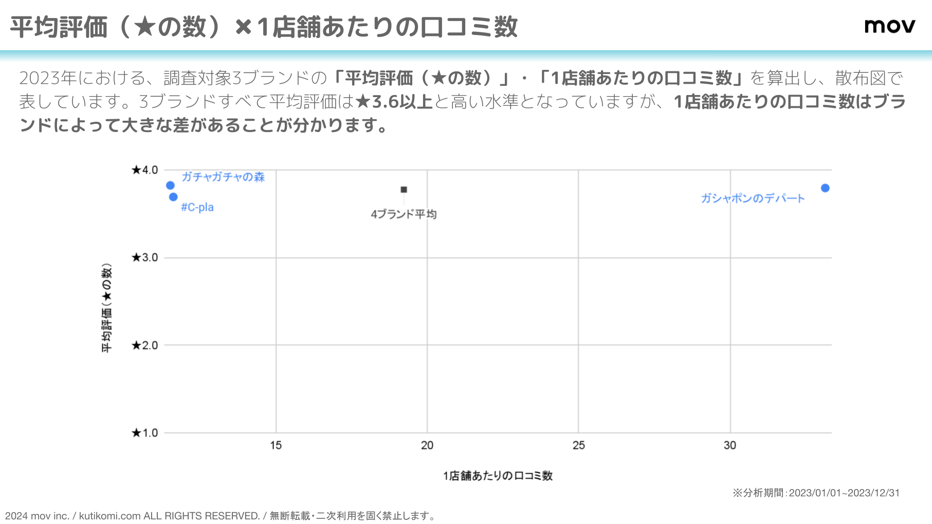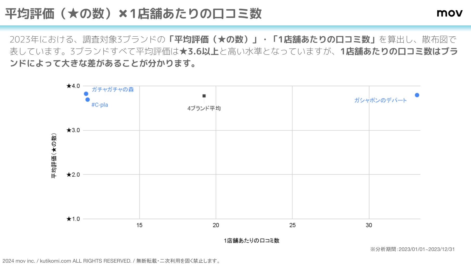 2023年における、調査対象3ブランドの「平均評価(★の数)」・「1店舗あたりの口コミ数」を算出し、散布図で表しています。