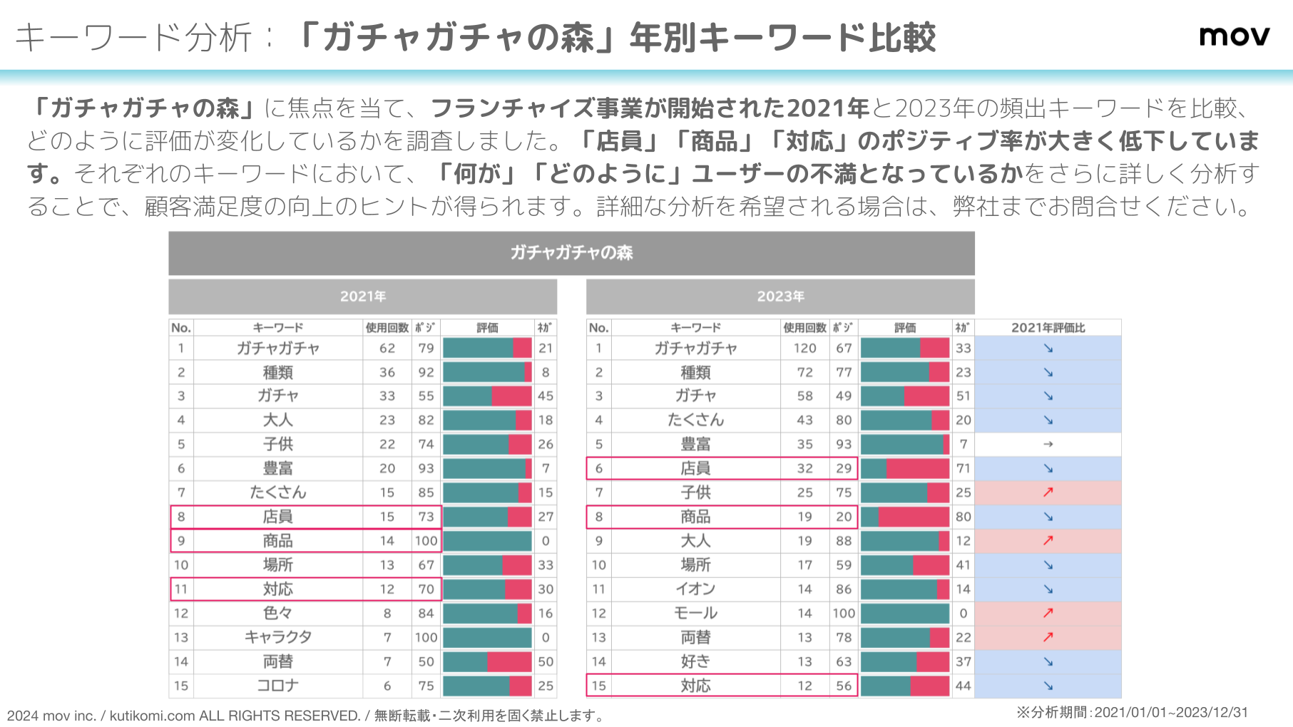 「ガチャガチャの森」に焦点を当て、フランチャイズ事業が開始された2021年と2023年の頻出キーワードを比較、どのように評価が変化しているかを調査しました。「店員」「商品」「対応」のポジティブ率が大きく低下しています。