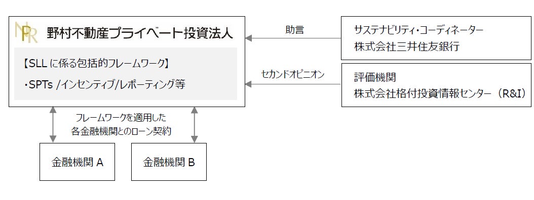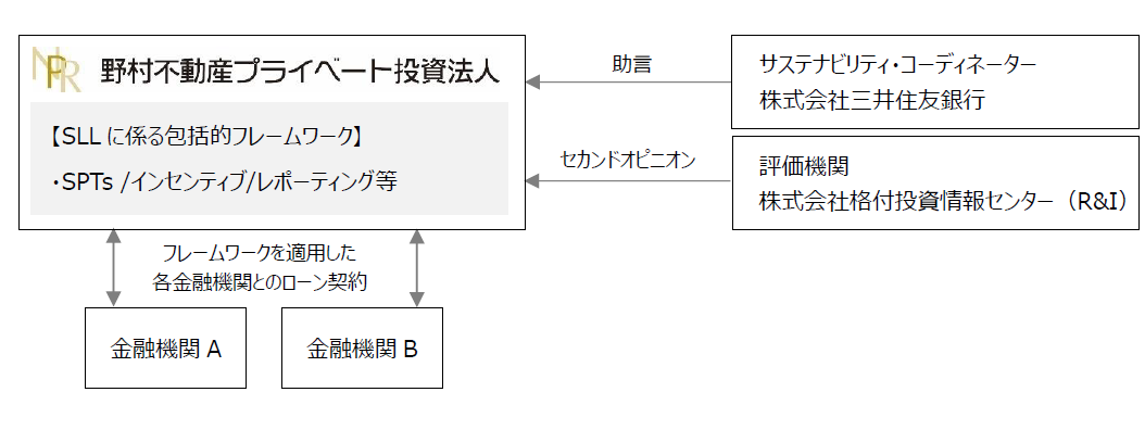 野村不動産投資顧問株式会社(本社:東京都新宿区/代表取締役社長:三浦 公輝、以下「当社」)は、運用を受託する野村不動産プライベート投資法人(以下「本投資法人」)が、サステナビリティ・コーディネーターである株式会社三井住友銀行の協力のもと、サステナビリティ・リンク・ローン(以下「SLL」)における包括的フレームワーク(以下「本フレームワーク」)を策定し、本フレームワークに基づく調達の第一弾として、2023年4月3日付の借入れにおいて、株式会社三井住友銀行及び株式会社三菱UFJ銀行から資金調達(以下「本借入」)を行いましたので、お知らせいたします。