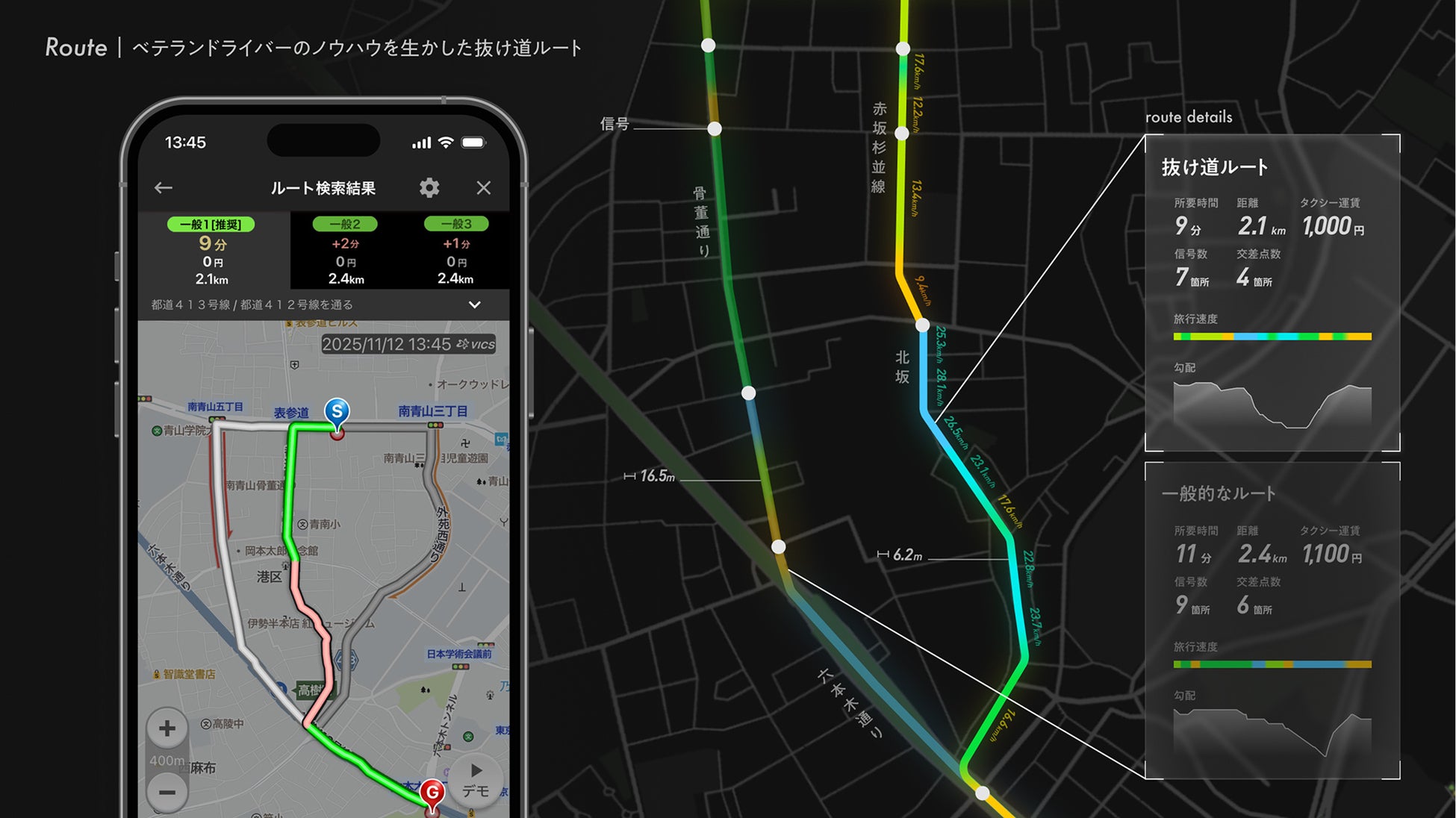 タクシードライバーの声をもとに、ベテランドライバーのノウハウを反映したプロ向けルートや、乗車禁止エリア・駅の終電時刻・通り名など業務に必要な情報を地図上に集約した『タクシーモード』を開発しました。タクシーならではの機能で、誰もが安心して業務できる環境を提供し、ドライバー不足の解消にも貢献します。