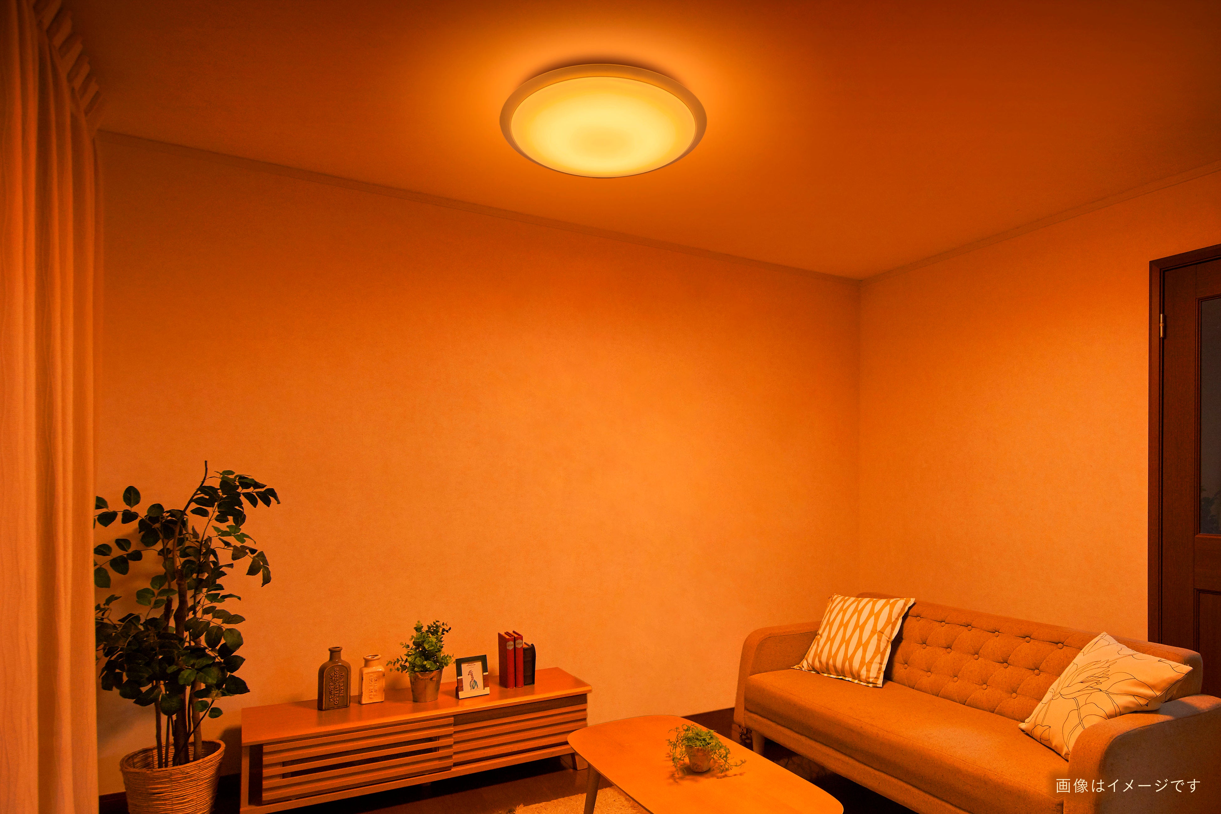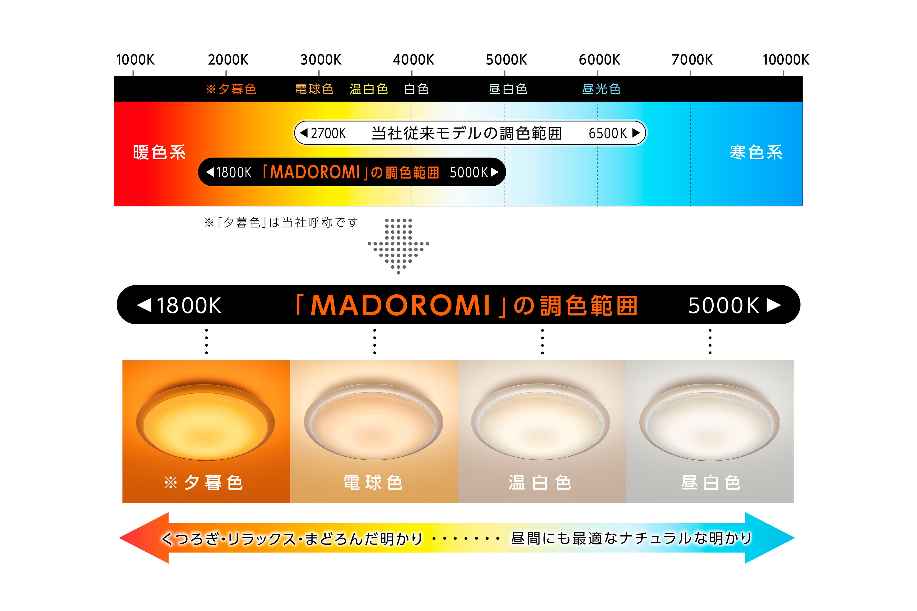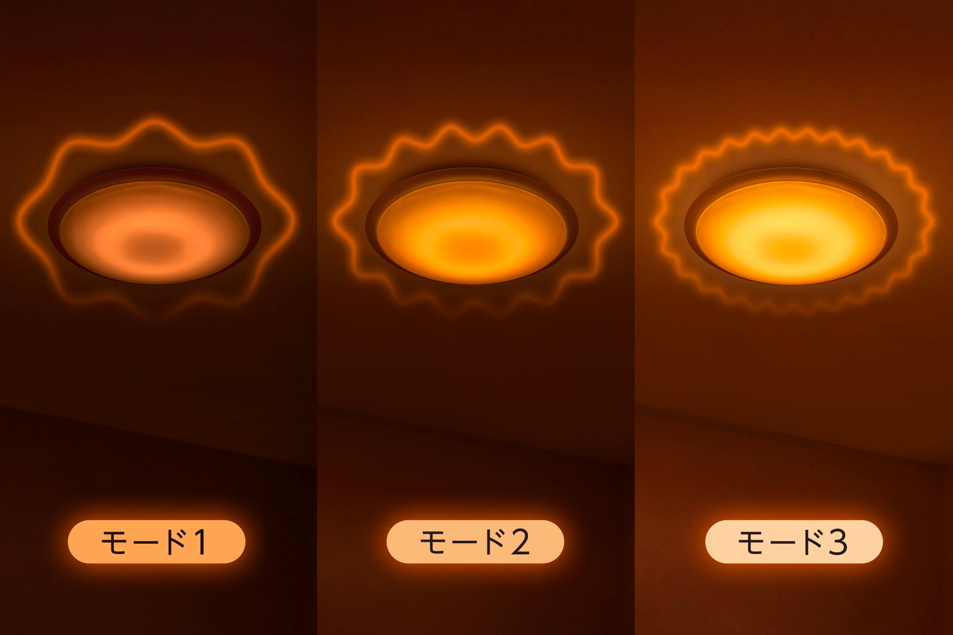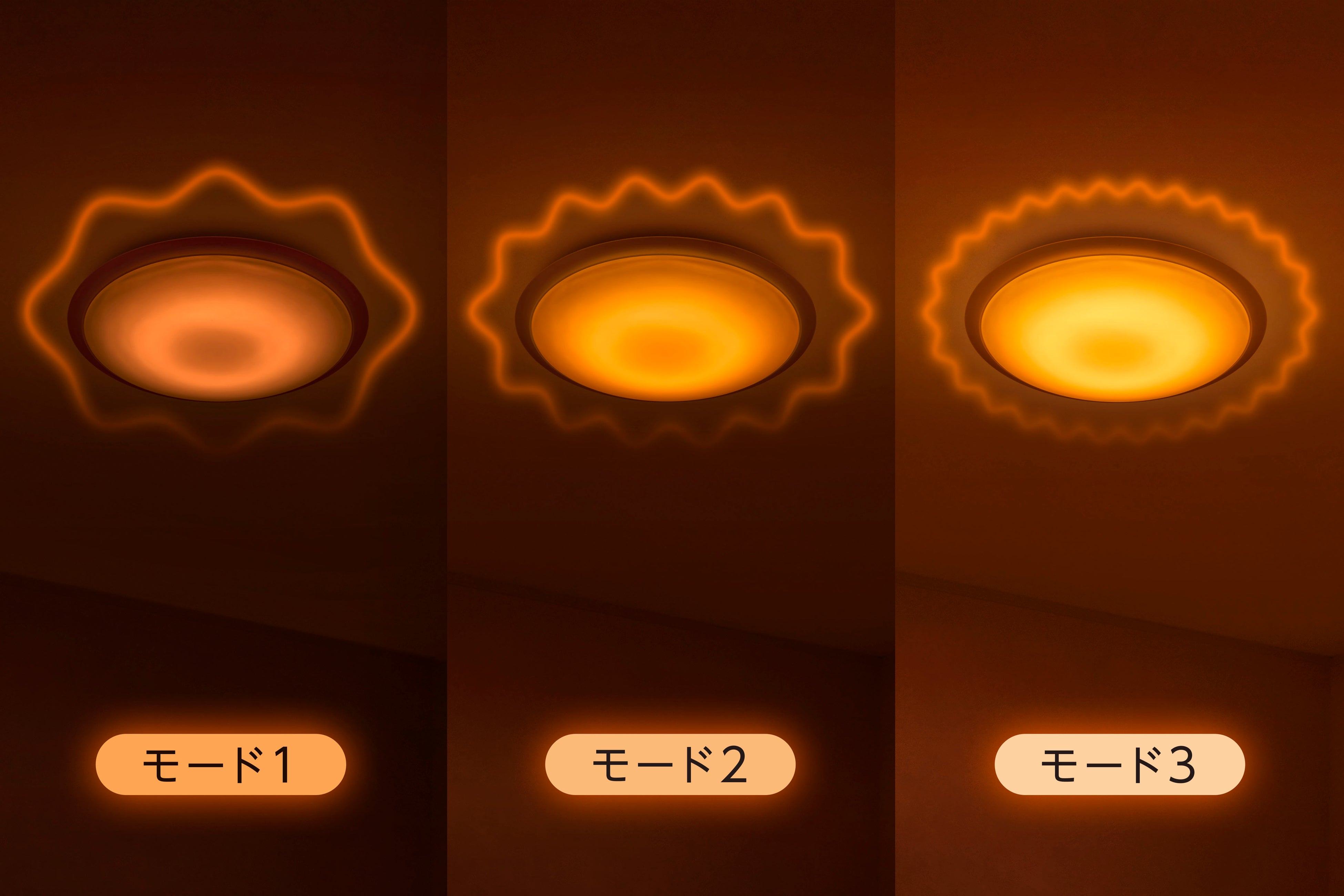 当社で独自に調査したところ、夜間の生活環境下では、青みが強い昼光色の光がほとんど使われておらず、電球色帯の暖かい明かりが多く使用されていることがわかりました。本製品では、一般的なLEDシーリングライトの調色範囲から、青みの強い昼光色帯をカットし、通常の電球色よりも暖かみのある色温度帯を加えることにより独自の焚き火モードを搭載した、揺らぎのある灯りを出せるLEDシーリングライトとなりました。
