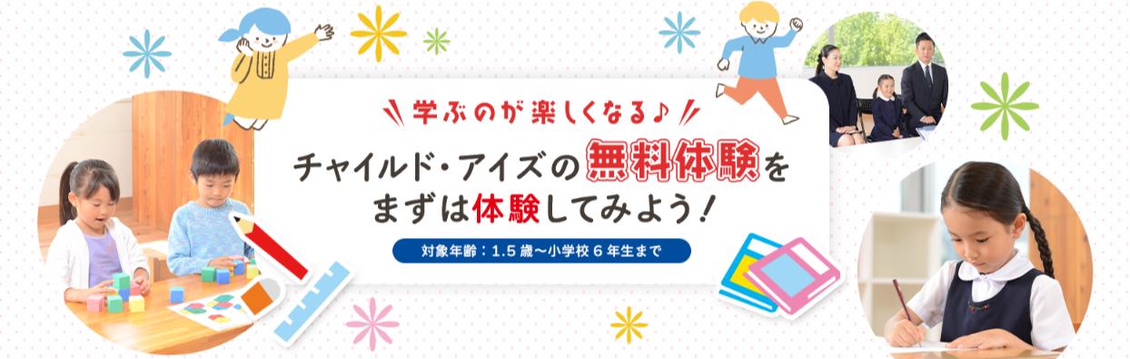 ・「知育って何?」「幼児教室って敷居が高い気がする」などの疑問や不安を解決!チャイルド・アイズの無料体験レッスンを年代別・コース別に解説等した特別webサイトも公開中。