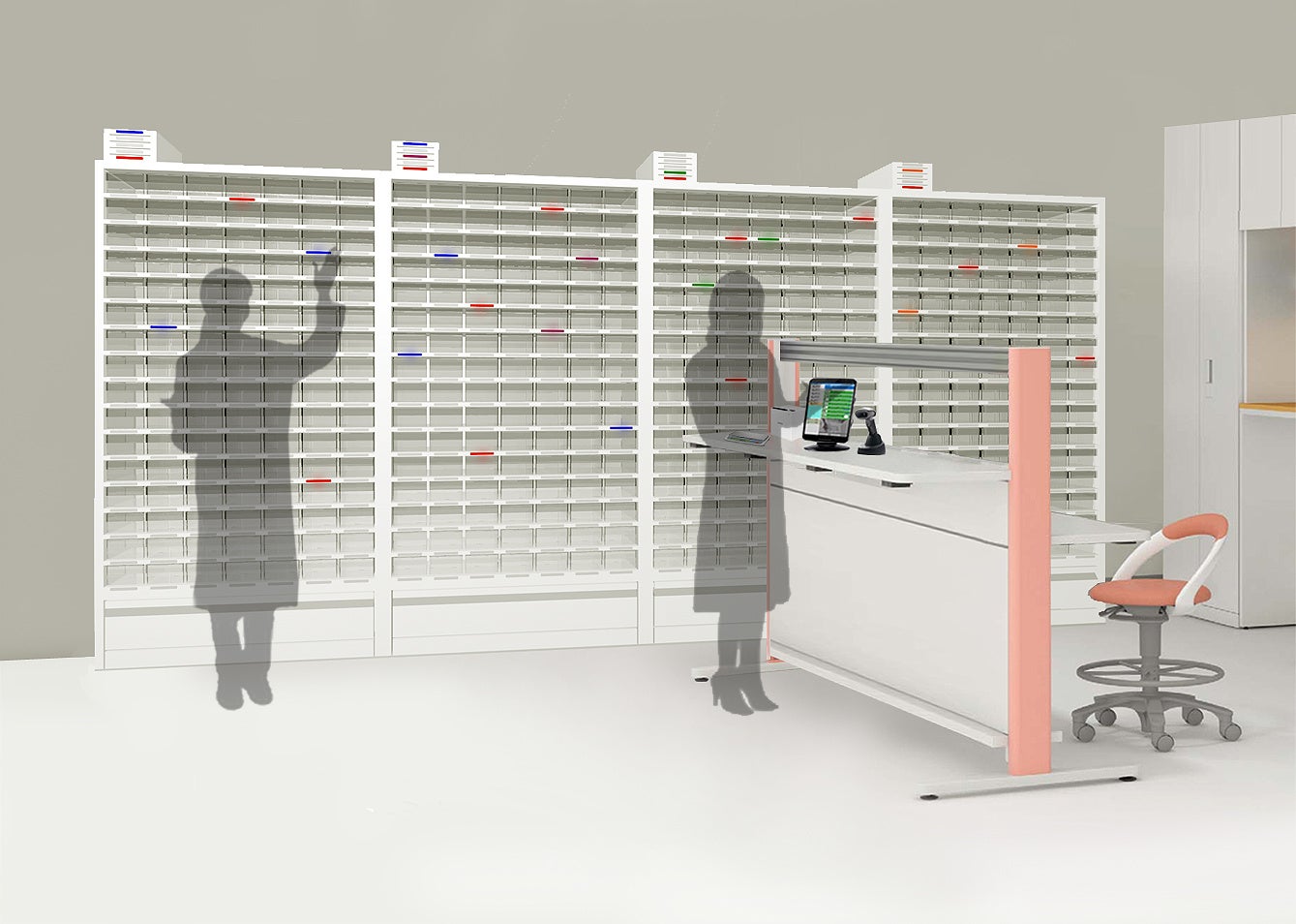 従来型の薬剤棚と同等のサイズ感を維持しつつ、LED表示で直感的な分かりやすさを追求