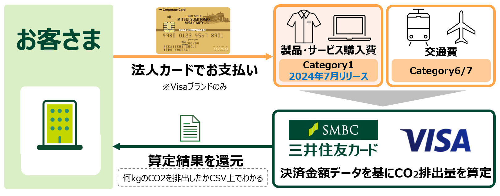 こうした状況に対応すべく、三井住友カードは、「法人カードデータCO2可視化サービス」を2023年11月より日本全国の企業向けに本格提供を開始し、以降、本サービスではScope3 Category6(出張)およびCategory7(通勤)の算定が可能でしたが、更に多くの企業に活用いただくためのレベルアップとして、今回Scope3 Category1(購入した製品・サービス)も正式に算定範囲として追加し、お客さまへ還元するサービスを提供いたします。