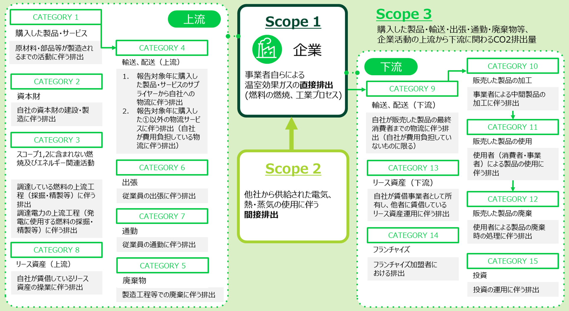 企業が脱炭素へ取り組むにあたり、CO2 を含む温室効果ガス(以下、GHG(※1))の排出量を算定・削減する対象範囲のことを「Scope(スコープ)」といいます。Scope は自社の直接排出を示す「Scope1」、他社から供給された電気、熱・蒸気の使用に伴う間接排出を示す「Scope2」、調達する原材料の製造時や、販売した自社製品が使われる際の排出など、サプライチェーンも含めた排出を示す「Scope3」に分類されます。中でも「Scope3」における排出量の算定には、特に詳細な情報収集が必要となるため、非常に難易度が高いと言われています。しかし、企業評価・情報開示・ESG 投資の観点で、Scope3 も含めた GHG 排出量の情報開示が強く求められております。
