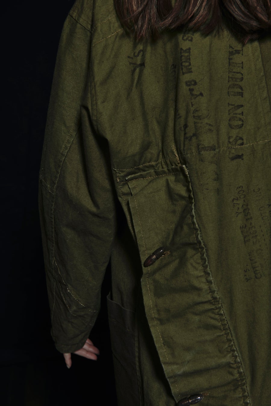 ミリタリーテント生地を解体・再構築したピースが、再構成されたシリーズ。現行のシートにデットストックのシートが構成され、年代やロットによる色味や褪せ方、保管時の汚れや擦れが、加工では創り出せない自然でユニークな表情で、ピエスユニック(一点物)といえるアイテム。