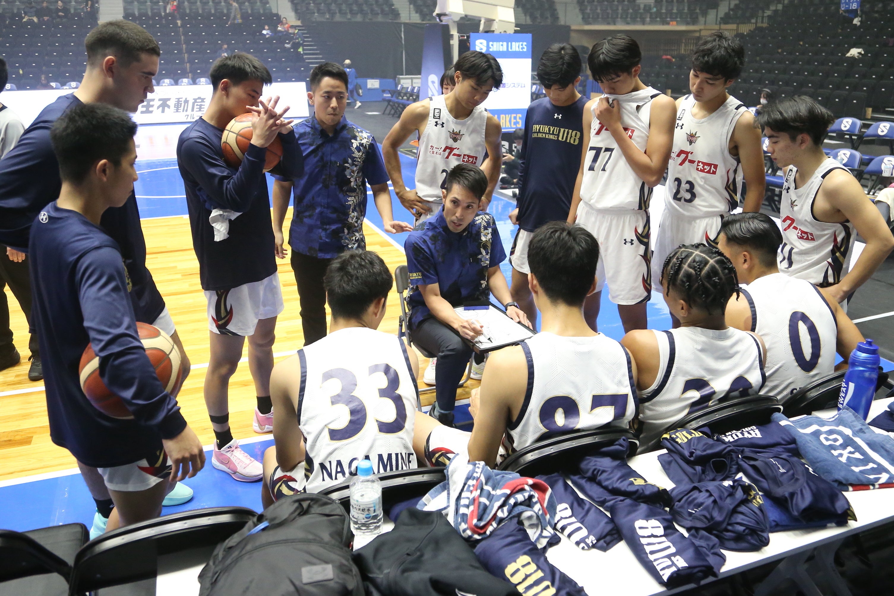 2クォーターも高確率な3Pシュートを維持する滋賀U18に対し、#33 長嶺充来選手の2Pシュートや#20 ルベン選手の2Pシュートで反撃の狼煙をあげると、#11 平良南海輝選手が3Pシュートを沈め一気に点差を2点にすると、#1 宜保選手が獲得したフリースローを沈め同点に。その後、#20 ルベン選手の2Pシュートで逆転に一時成功しますが、互いに譲らない一進一退の攻防が続きます。#99 新垣選手が難しい体制での2Pシュートを決めると、#77 佐取龍之介選手が相手の3Pラインからの超ロングシュートがブザーと同時に決まり38-33で後半へ。