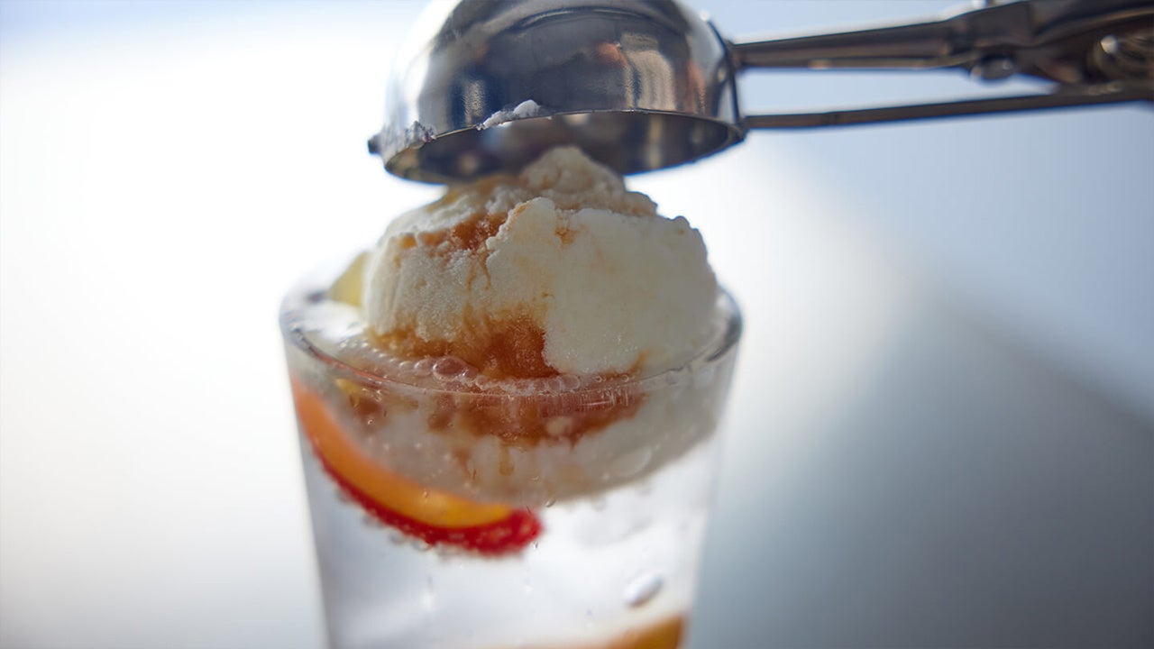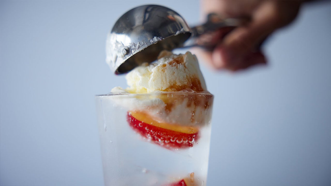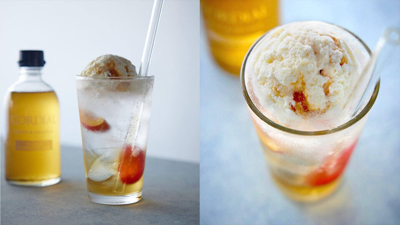 今年のコーディアルシロップは「アイスクリームソーダ」を提案。シロップを炭酸で割って、夏におすすめのジャムをトッピングしたアイスをのせたら暑い季節にすっきりおいしい、爽やかなアイスクリームソーダのできあがりです。コーディアルシロップを使ってつくる、夏ならではのドリンクデザートをおたのしみください。