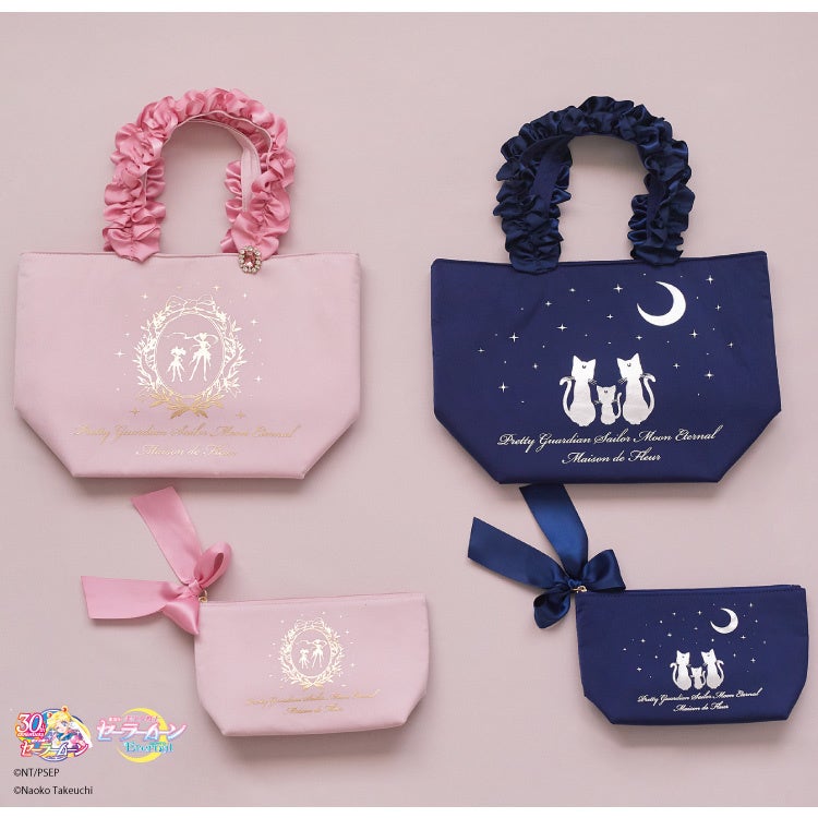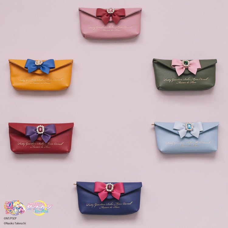 その他、セーラー戦士たちのイメージカラーをMaison de FLEURの世界観に落とし込んだカラーのポーチや、スーパーセーラームーンとスーパーセーラーちびムーンのシルエットがゴールドの箔(ピンク)で、劇中に登場するルナ、アルテミス、ダイアナのシルエットがシルバーの箔(ネイビー)でプリントされたバッグ・ポーチなども展開いたします。