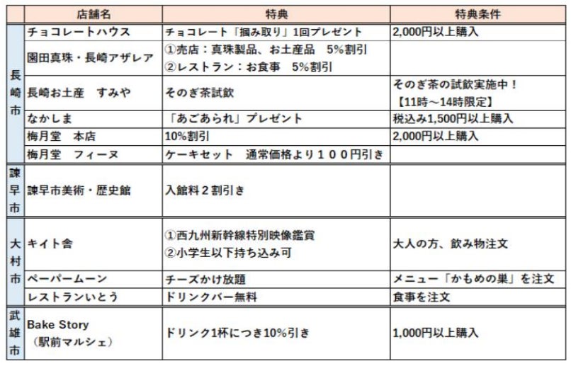 西九州新幹線各駅周辺の一部店舗での特典を受けられます。