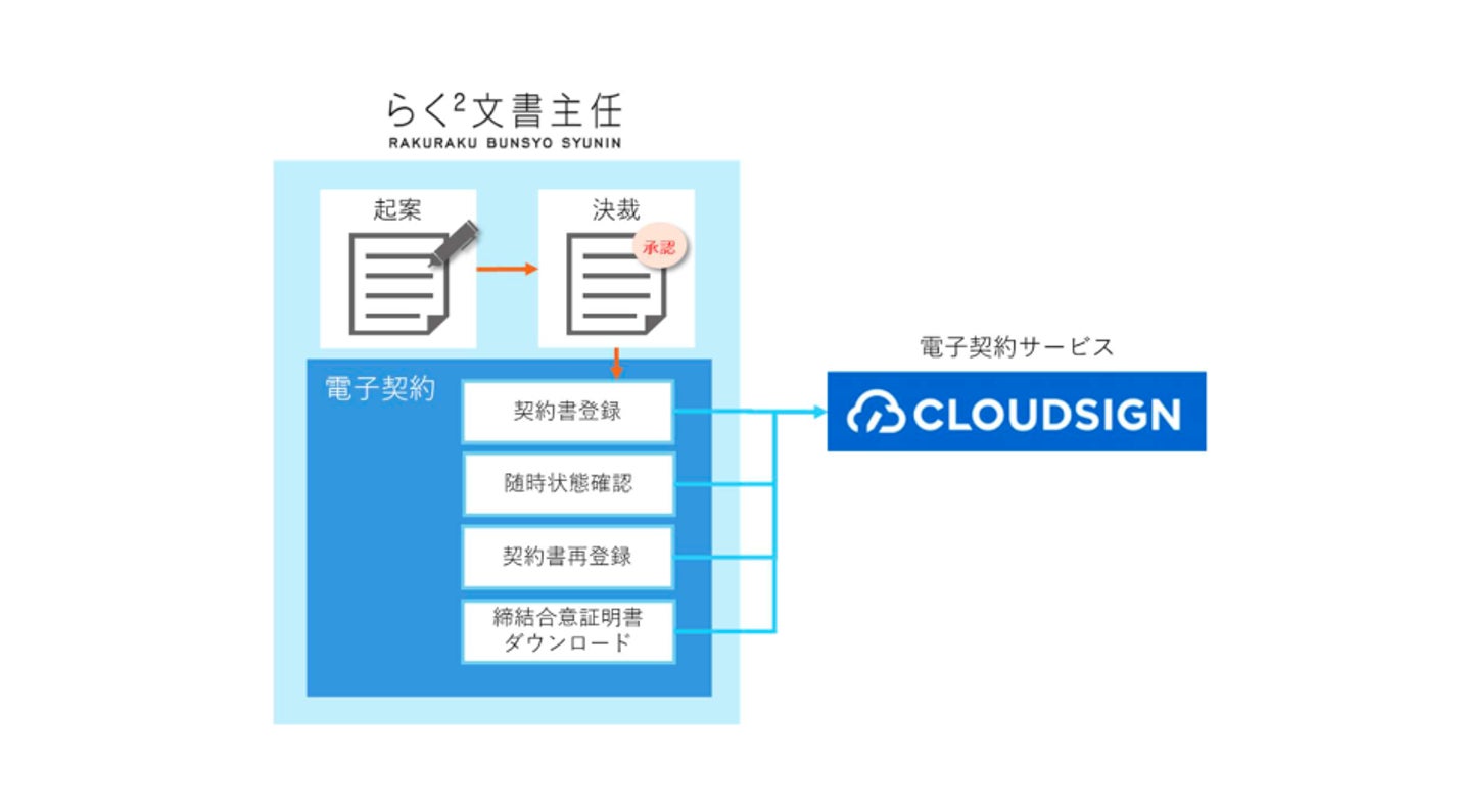 今回、「らく2文書主任®」と「クラウドサイン」がWebAPI連携することで、ユーザーは「らく2文書主任®」上から直接電子契約の締結が可能になります。この連携により、電子契約サービスにログインする手間なく、承認済みの契約書を「らく2文書主任®」内で一元管理できるようになります。また、契約書送付前に庁内での承認プロセスを経るため、高いコンプライアンスを遵守した安全な契約運用が可能です。