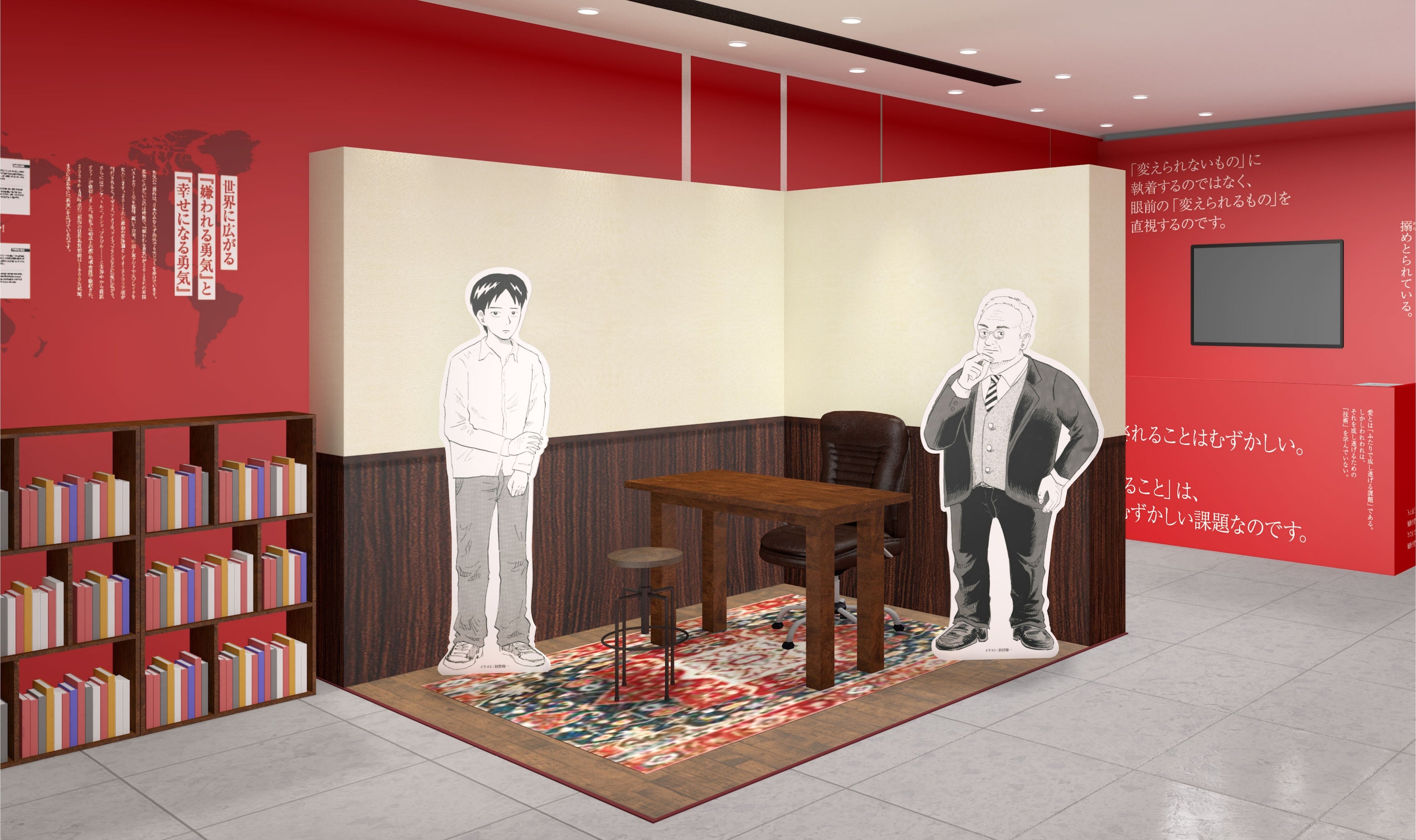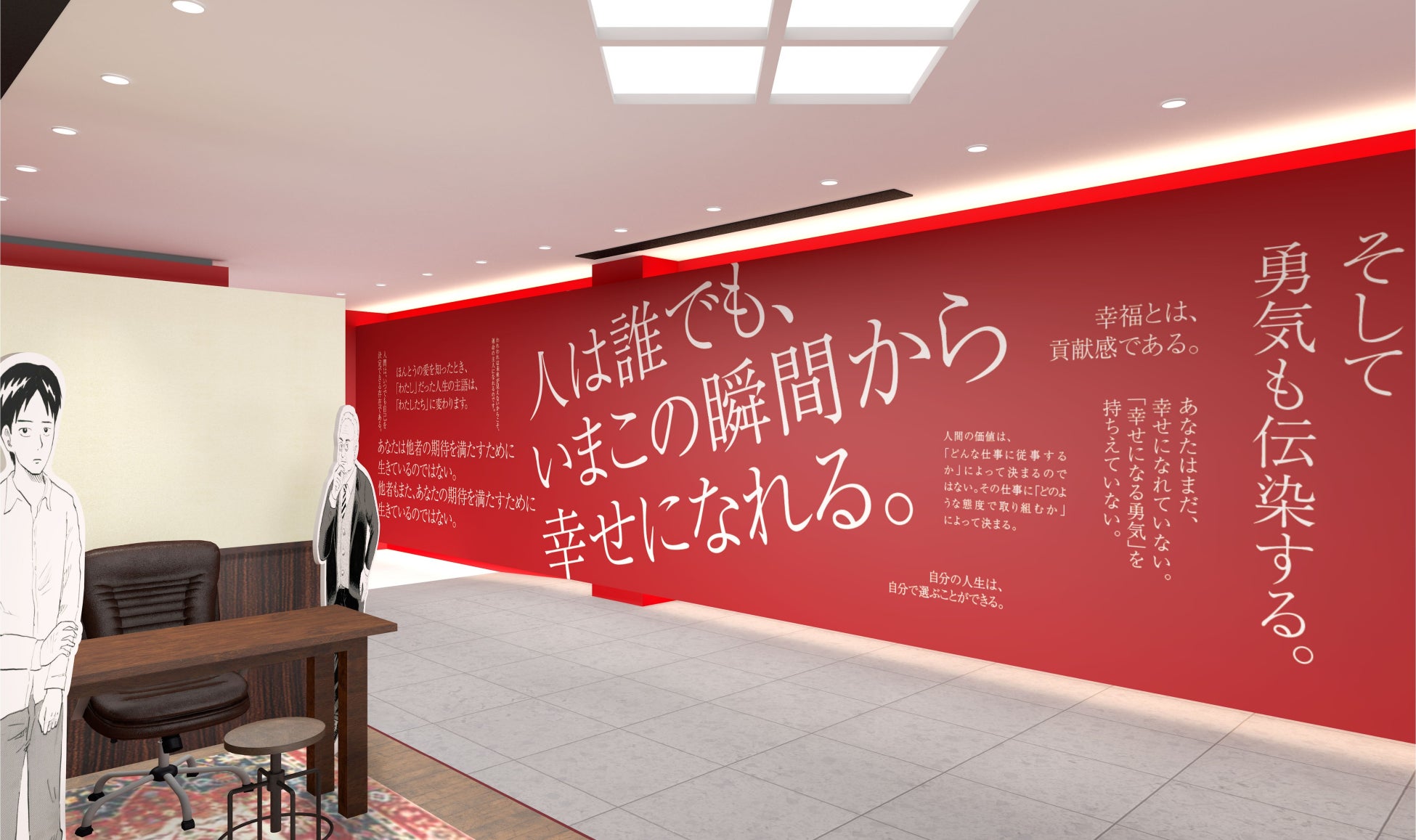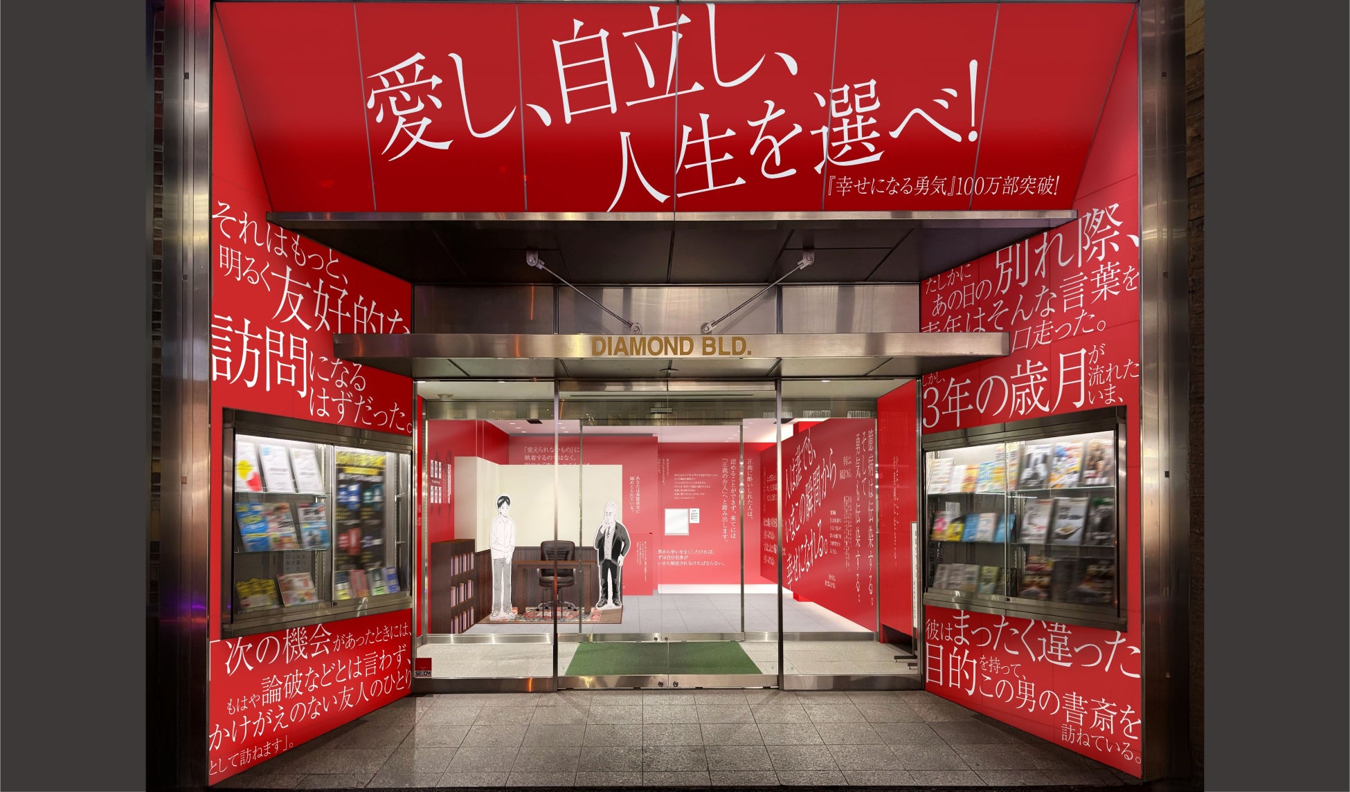 ダイヤモンド社として初となる、本社ビル1階でのミニポップアップイベントの開催が決定しました。会場では、『幸せになる勇気』の名言の数々を壁一面にデザインし、書影カラーである赤を基調に空間をラッピング。エントランスには、哲人の書斎をイメージしたフォトスポットを設置するほか、『嫌われる勇気』を含む各国翻訳本とともに、世界中から寄せられた読者の声も展示します。さらに、著者両名に悩み相談ができる「哲人へのお悩み相談ポスト」や、来場者が感想を書き込むことができる「推しコメントコーナー」など、参加型コンテンツも用意しました。開催期間中の平日は、どなたでも無料で入場いただけます。『幸せになる勇気』の世界観を体験できるイベントとして、ぜひご来場ください。