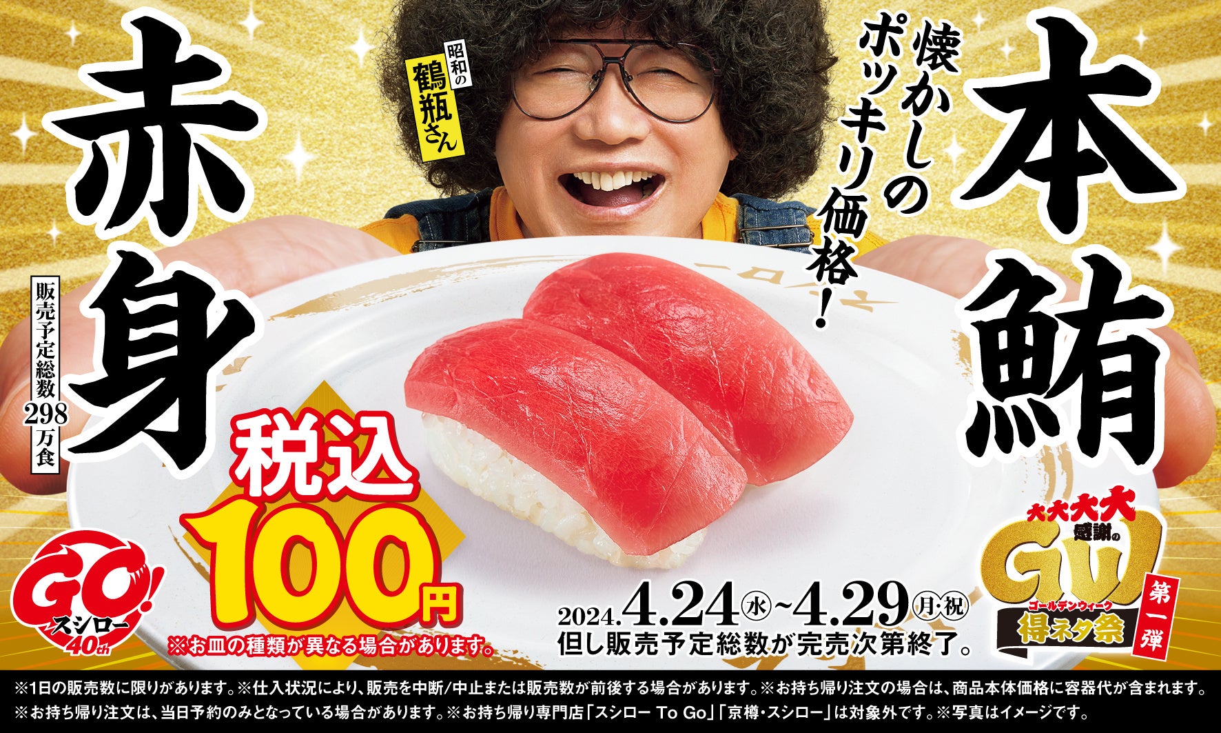 4月24日(水)からは、『大大大大感謝のGW得ネタ祭 第一弾』を開催いたします。目玉商品は、40周年の記念商品としてご提供する「本鮪赤身」です。“うまいすし”を少しでもお手頃にお腹いっぱい召し上がっていただきたい、という想いから、まぐろの王様といわれる“本鮪”の赤身2貫を価格帯が異なるスシロー全店において“税込100円”で販売いたします。目利きのバイヤーが厳選し、赤身ならではの深い濃厚な旨みをご堪能いただけます。