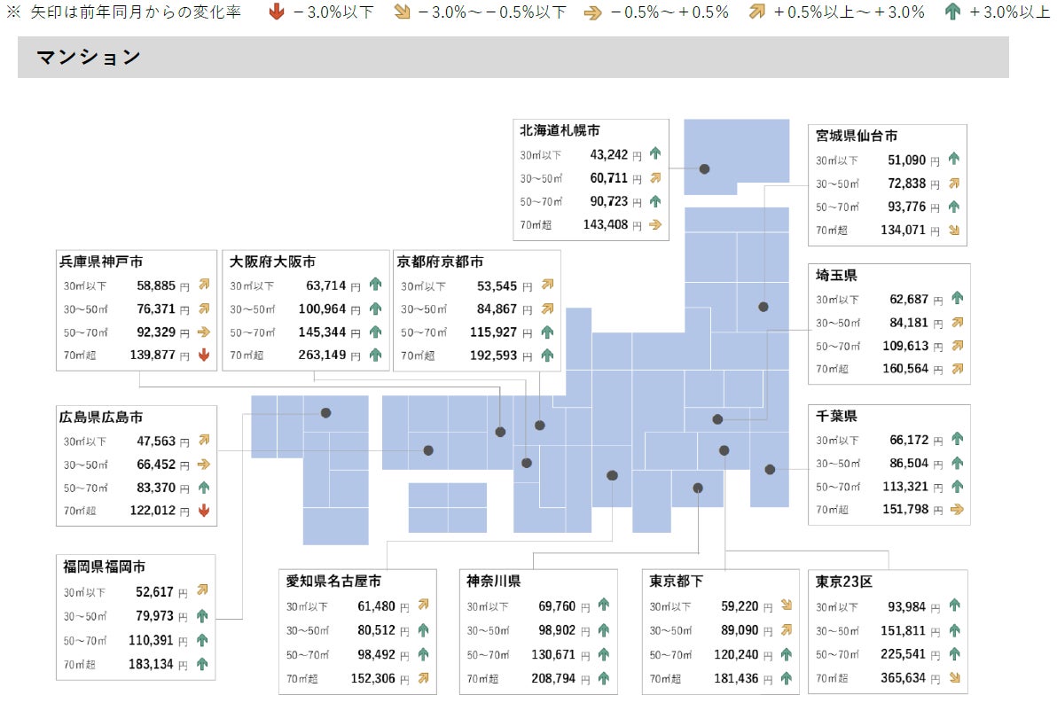 ●マンションは、ファミリー向きが3カ月連続して神戸市を除く12エリアで前年同月を上回る。中でも、東京23区・埼玉県・千葉県・札幌市・広島市・福岡市の6エリアは2015年1月以降最高値を更新。