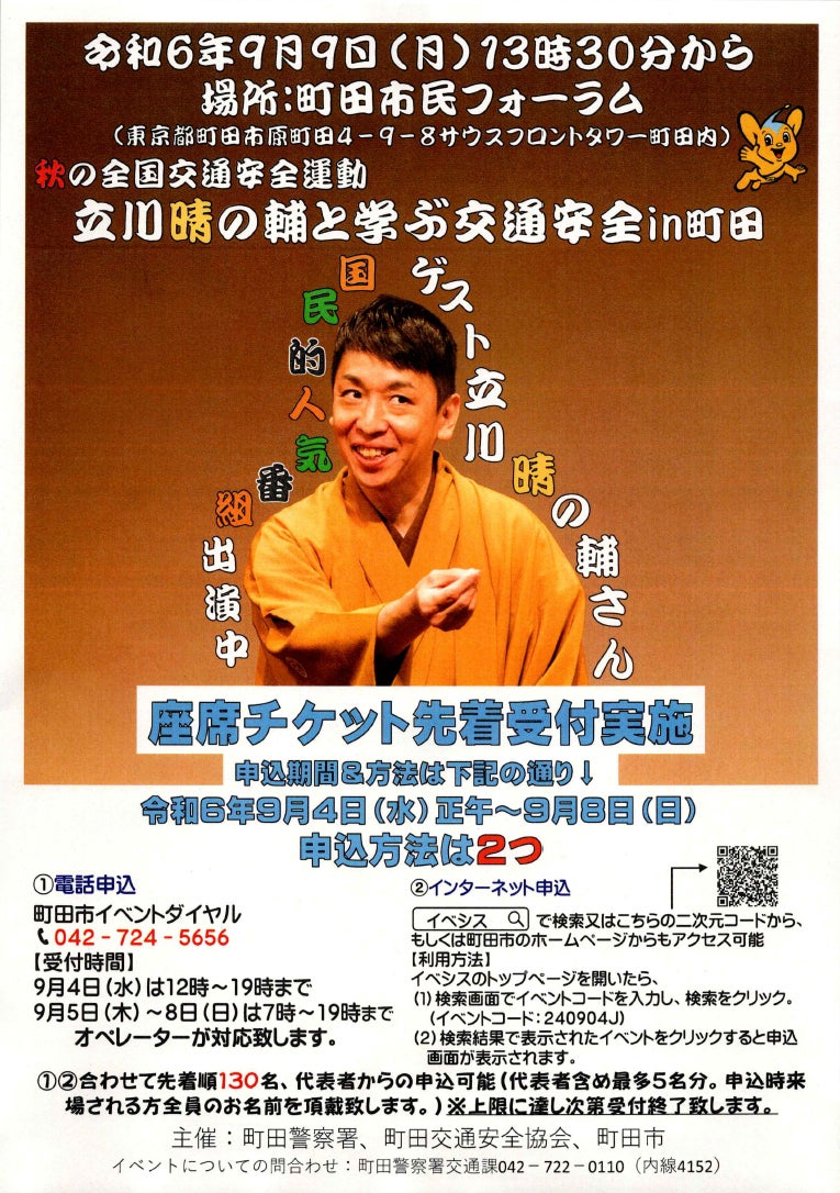 町田市では、市民の交通安全意識の向上を図るため、9月21日から始まる秋の全国交通安全運動に先駆けて、国民的人気番組に出演している落語家立川晴の輔さんをゲストに迎え、交通安全イベントを実施します。