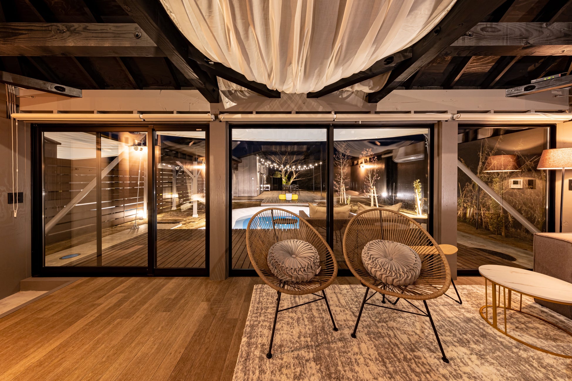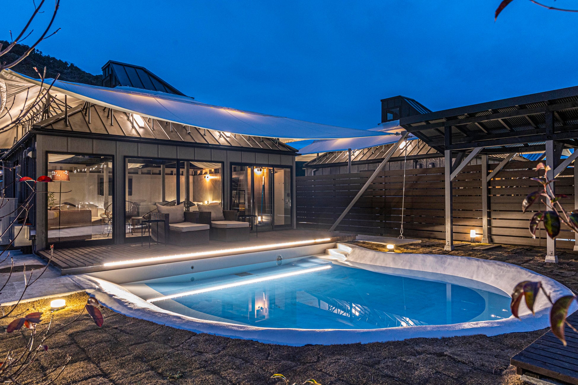 千葉県南房総市の自然豊かなエリアに位置するドッグヴィラ千葉南房総は、2023年2月にオープンした 宿泊施設です。温泉が湧き出る4棟限定のプライベートヴィラには専用の温泉、サウナ、プール、ドッ グランが完備され、愛犬と一緒に贅沢で快適なひとときを過ごすことができます。