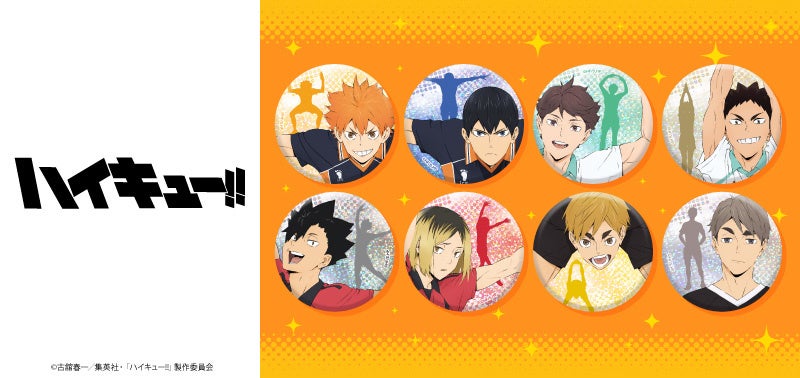 アニメ「ハイキュー!!」より、体全体を使ってイニシャルを表現したキャラクターのビジュアルをデザインしたキラキラ缶バッジが登場!