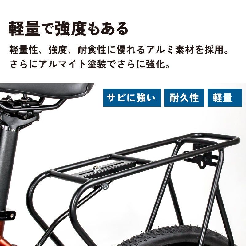 このリアキャリアは品質が良く軽量で耐食性に優れるアノダイズド アルミニウムを採用。