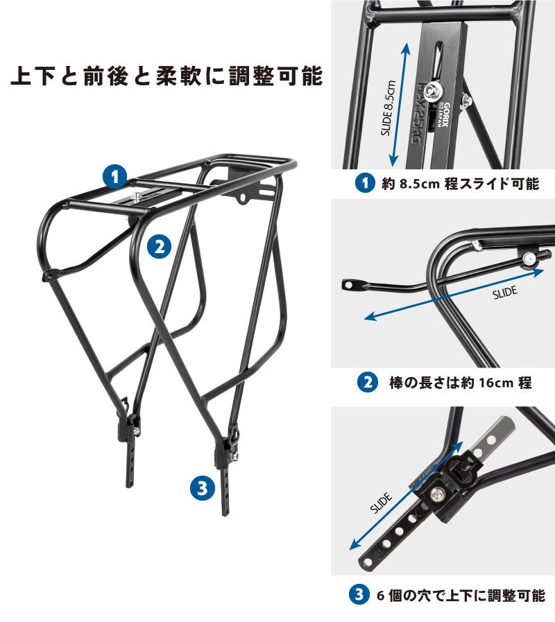 自転車通勤・通学やツーリング、旅行、お買物に最適なリアキャリアです。