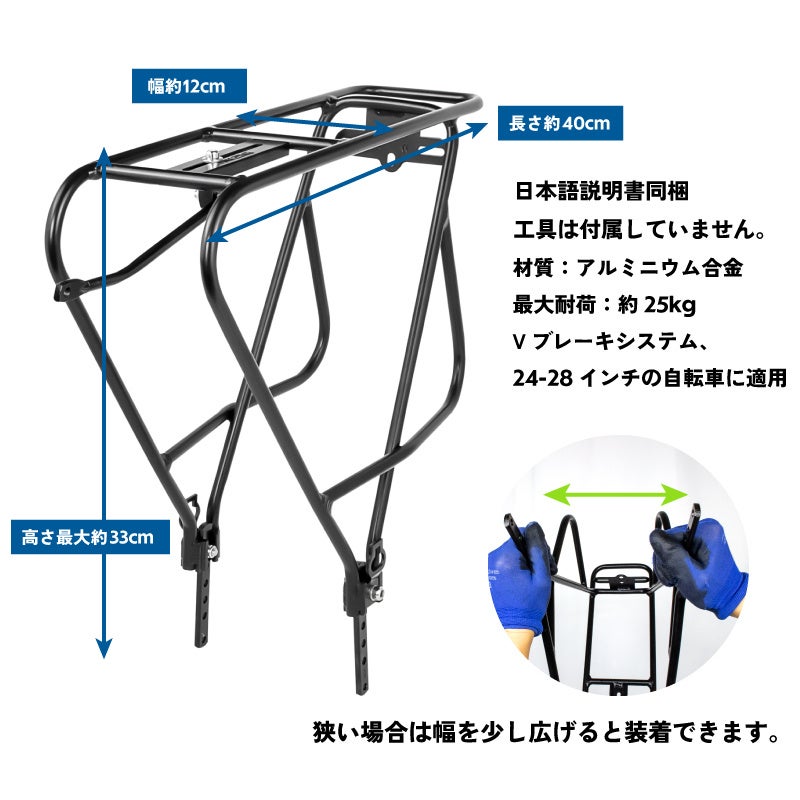 自転車荷台、自転車用リアキャリアを装着して荷物を沢山自転車に積載できる、自転車通勤・通学やツーリング、旅行、お買物に最適なリアキャリアです。