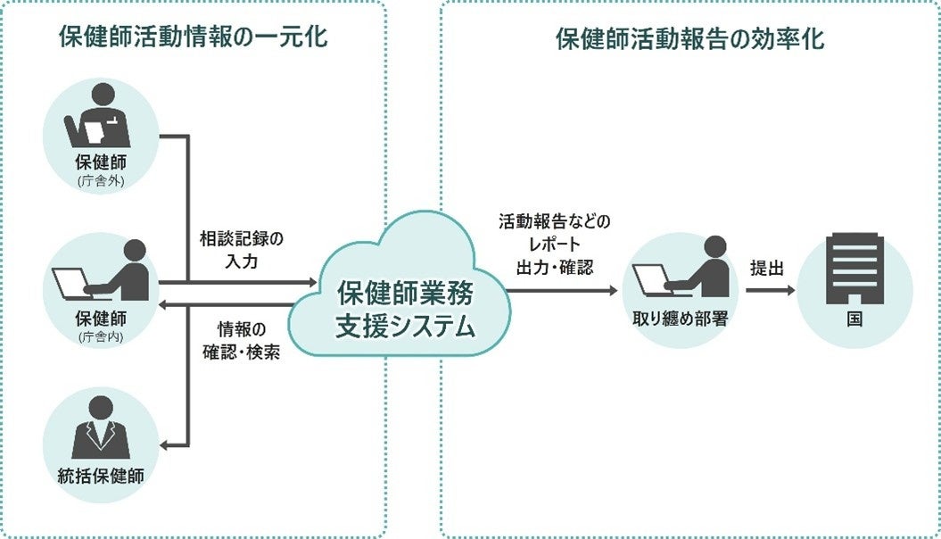 本システムは、従来、紙やExcelで実施していた記録票・報告書作成などをデジタル技術で効率化するとともに、デジタルデータとして保管することで業務の継続性を確保可能にします。また、保健師が直感的に利用できるよう、保健師業務プロセスを踏襲したポータルや機能などを実装しています。これにより、保健師がより専門性を発揮する業務に注力できる環境を作り、住民サービス向上の実現に貢献します。