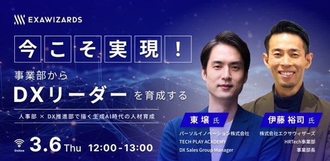 「はたらいて、笑おう。」をビジョンに掲げるパーソルグループのパーソルイノベーション株式会社 TECH PLAY Company(本社:東京都港区、TECH PLAY Company代表:片岡 秀夫)が運営する、実践型のオーダーメイド研修でDX人材を育成する『TECH PLAY Academy』(https://business.techplay.jp/)は、2025年3月6日(木)12:00~13:00に株式会社エクサウィザーズと「事業部からDXリーダーを育成する」をテーマにしたオンラインセミナーを共同で開催します。