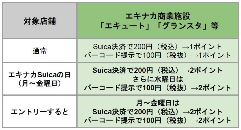 ●エキナカ商業施設「エキュート」「グランスタ」等では、 JRE POINT WEB サイトに登録した「Suica で貯まる JRE POINT 」が 月曜日から金曜日は通常の2倍になるほか、キャンペーンサイトにエントリーをすると「バーコード提示で貯まるJRE POINT 」も月曜日から金曜日は毎日 2 倍になり、ダブルでポイントが貯まります。