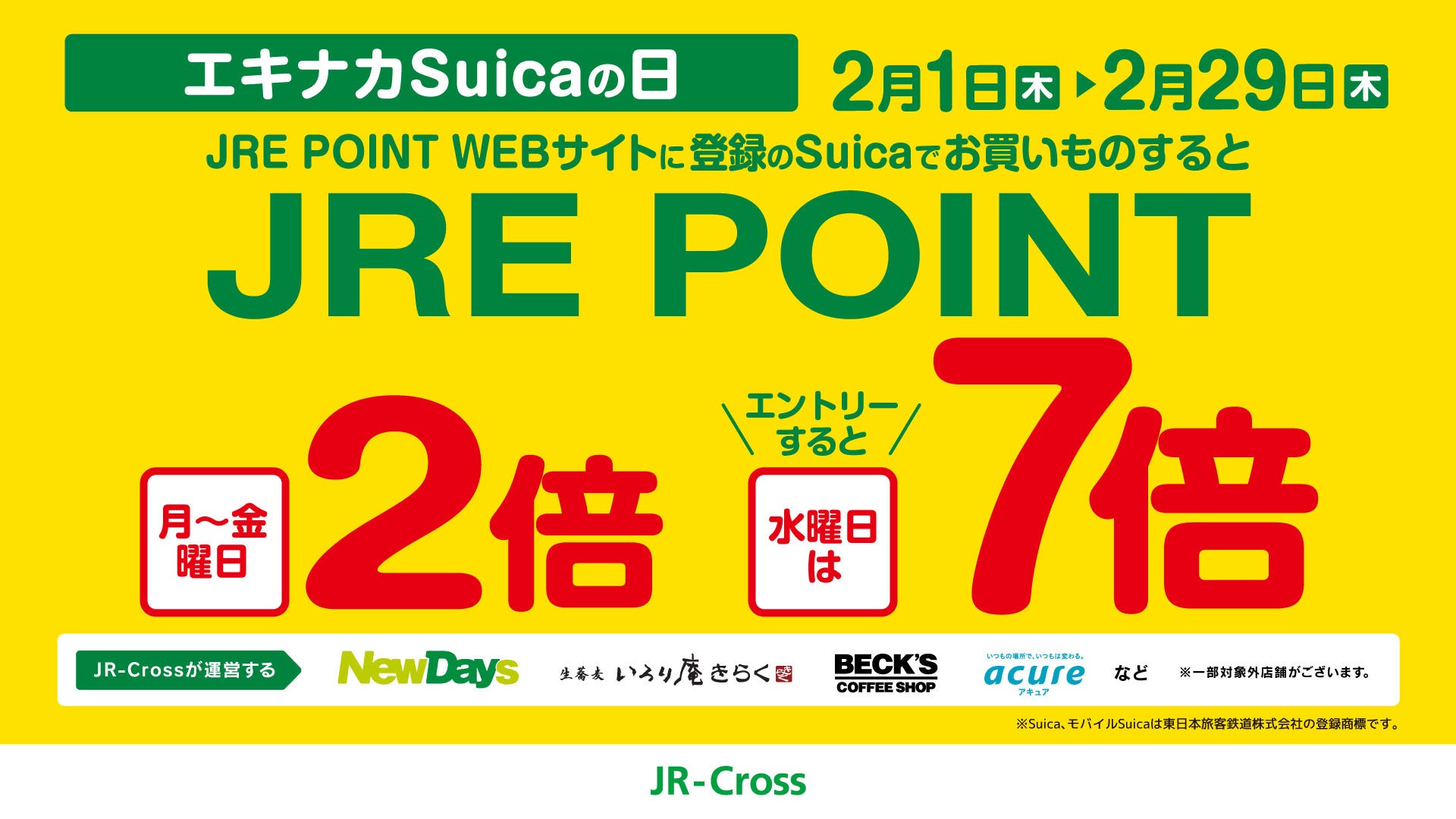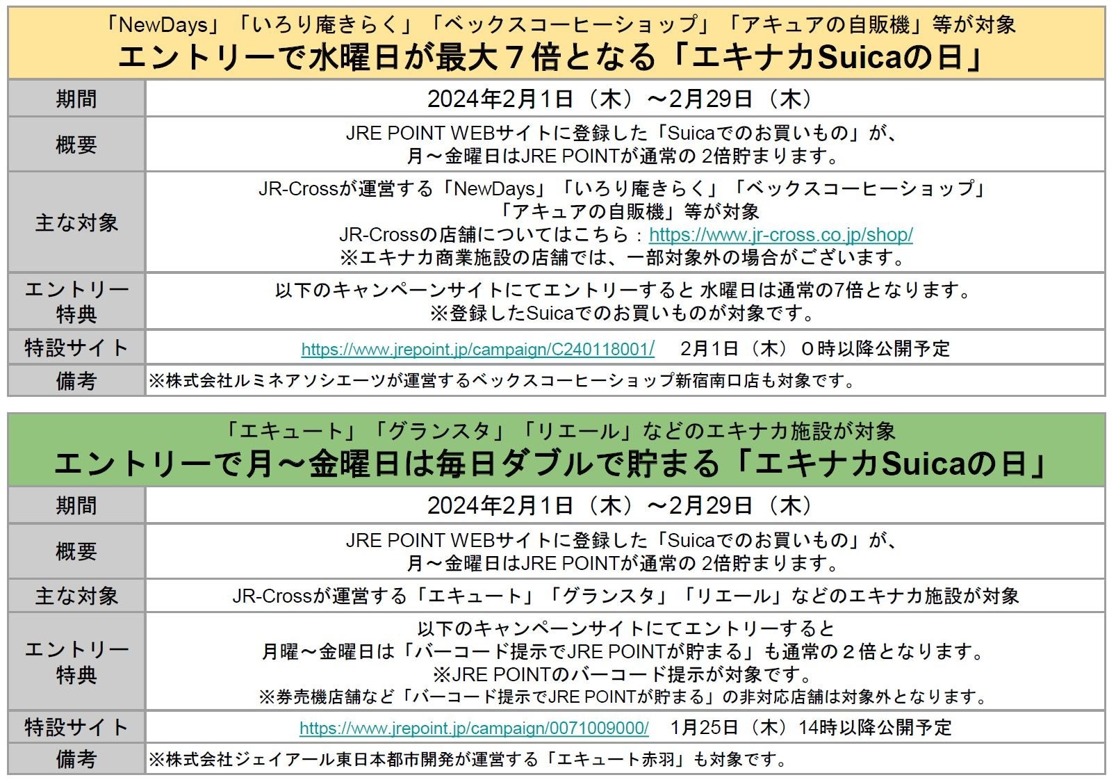 「 JR-Cross 」)は、 2024 年 2 月 1 日(木)から 2 月 29 日(木)までの期間、 Suica を使って JRE POINT がオトクに貯まる「エキナカ Suica 月間」として2つのキャンペーンを実施します。