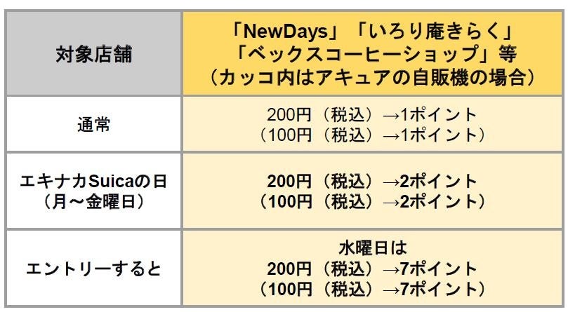 ●「 NewDays 」「いろり庵きらく」「ベックスコーヒーショップ」「アキュアの自販機」等では、JRE POINT WEBサイトに登録した「 Suica で貯まる JRE POINT 」が 月曜日から金曜日は通常の2倍となります。さらにキャンペーンサイトにエントリーをすると水曜日が最大 7 倍となります。