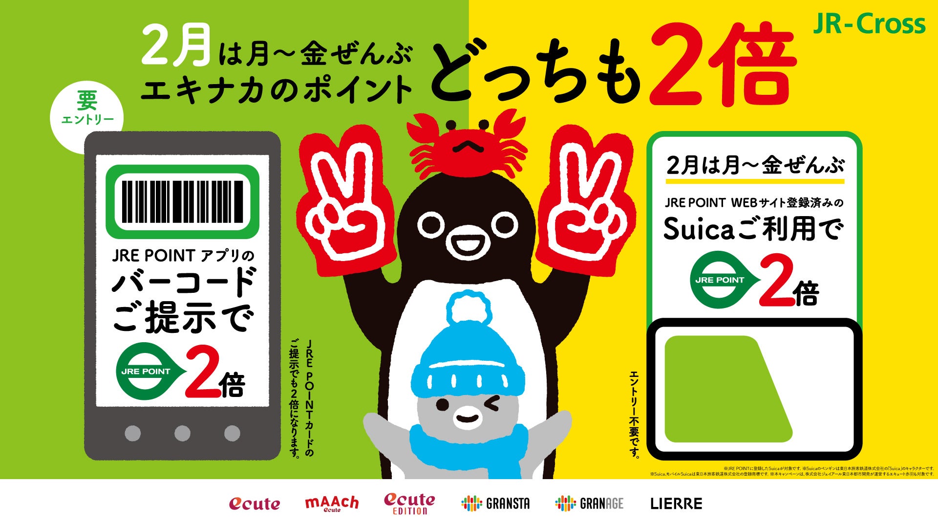 2月限定!水曜日だけじゃない!月曜日から金曜日までSuica で JRE POINT が2倍!!2月は「エキナカ Suica の日」が拡大します!
