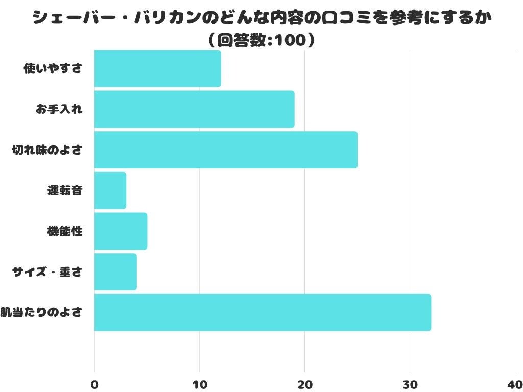 シェーバー・バリカンのどんな内容の口コミを参考にするかをアンケートにて調査したところ、1位は「肌当たりのよさ」でした。