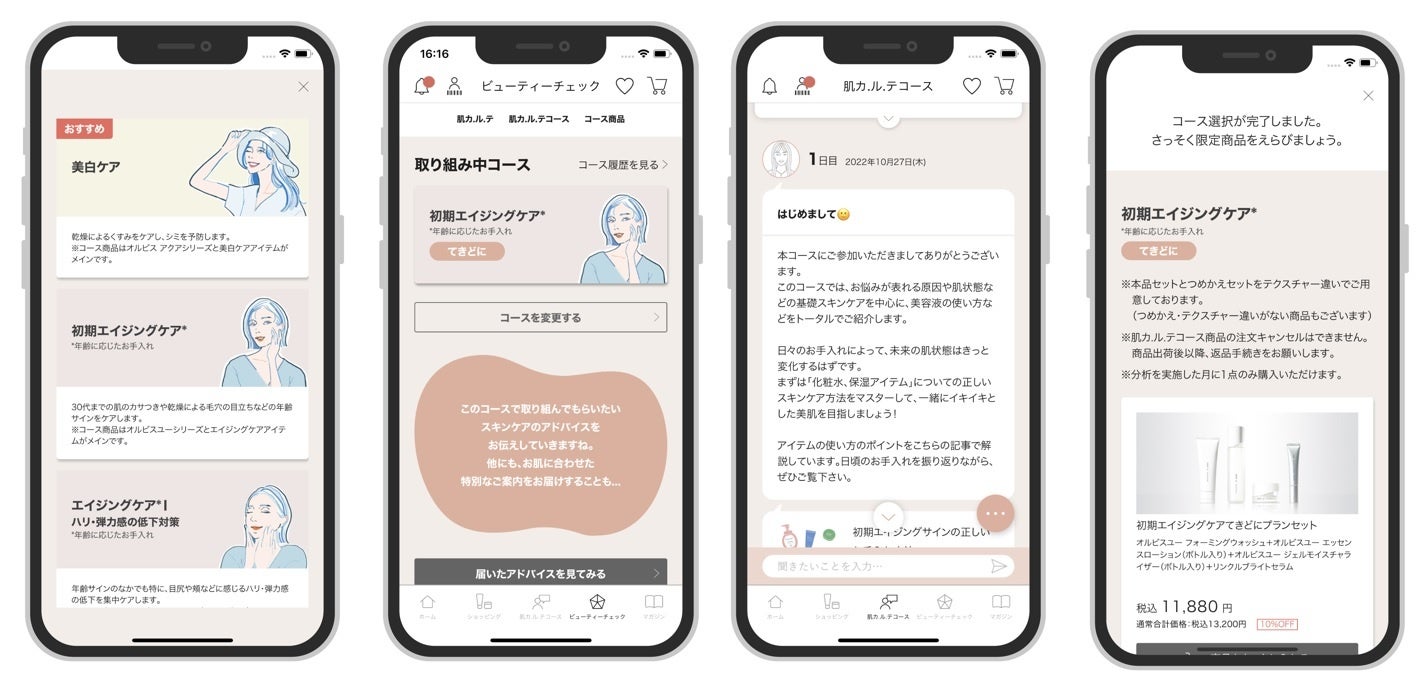 オルビスは、お客様に寄り添いながら一人ひとりの肌の状態に合わせたお手入れ方法と適切なアイテムご提案することを大切にしてきました。オルビスが培ってきた、一人ひとりのそれぞれに合わせたカリキュラムで、毎日の美容ルーティンに必要なテクニックを取り入れていただき、アプリを通じて、今の肌と未来の肌のキレイな肌作りをサポートします。