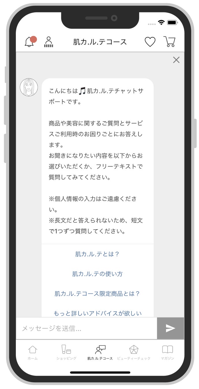 さらに、『肌カ.ル.テ』サービススタートに併せて、アプリ内でのチャットを開始します。24時間365日対応できるチャットボット及びビューティクリエイターによる有人チャット(平日10:00~17:00対応)にてお客様の疑問を瞬時に解決します。(『肌カ.ル.テ』コースに入らなくても相談可能です。)