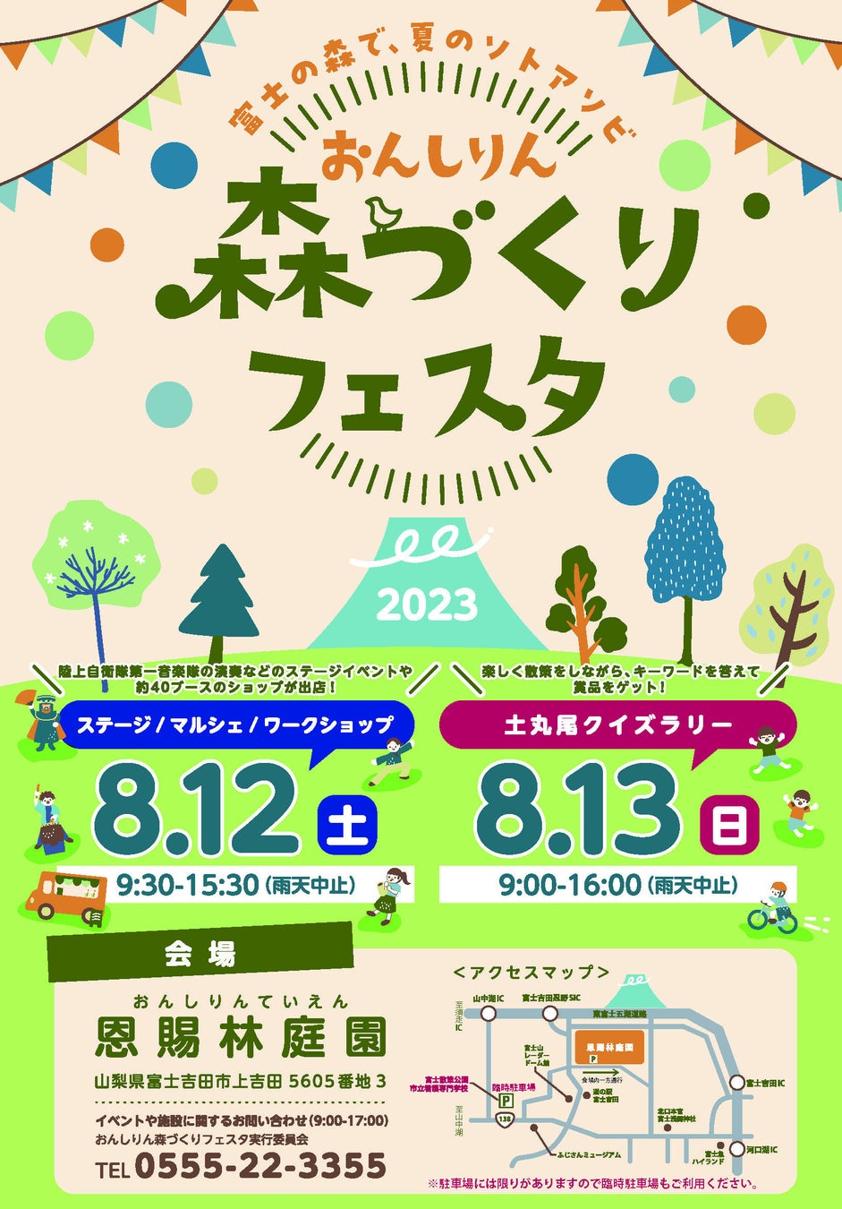 富士吉田市外二ヶ村恩賜県有財産保護組合(以下、恩賜林組合)等で構成され、総合エンターテインメント企業である株式会社アミューズが企画プロデュースに参画する「おんしりん森づくりフェスタ実行委員会」(会長:恩賜林組合 組合長 渡辺正志)は、総合企業富士山とともに育まれてきた富士北麓の大自然の森林に位置する恩賜林庭園(山梨県富士吉田市上吉田5605番地3)を中心に、自然や森林の中で、ステージパフォーマンスや音楽、アクティビティツアー、ワークショップ、キッチンカー、マルシェなど様々なソトアソビを体験できる「2023おんしりん 森づくりフェスタ」を、2023年8月12日(土)、13日(日)の二日間にわたり開催いたします。