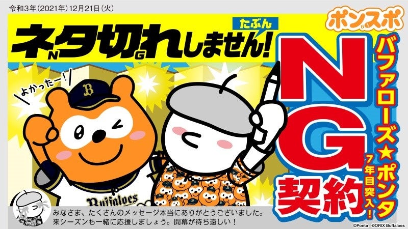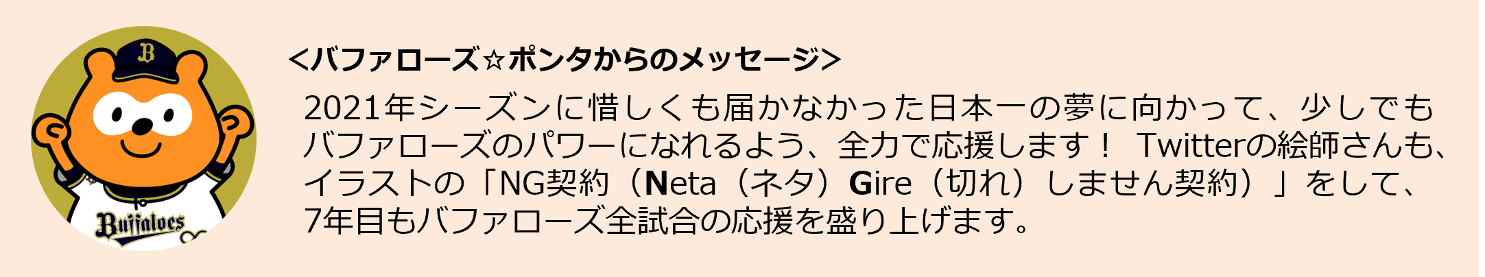 「バファローズ☆ポンタ」は、2022年シーズンも引き続き、ファンの皆様とともに、オリックス・バファローズならびに野球界全体を全力で応援します。