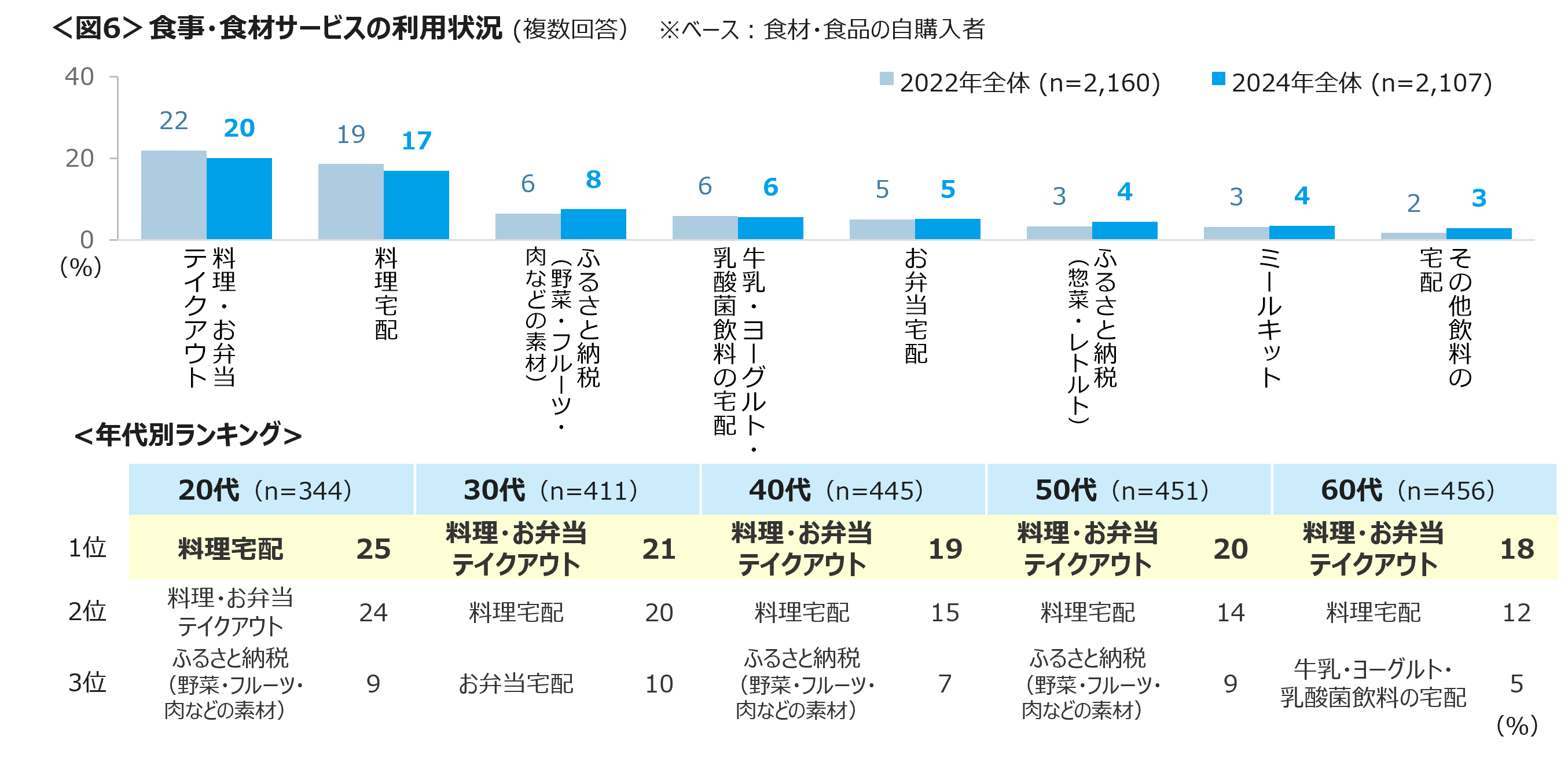 食事や食材に関するサービスの利用率は、「料理・お弁当のテイクアウト」20%、「料理宅配」17%が高い。20代のみ、テイクアウトよりも、フードデリバリーの利用割合がわずかに上回る結果であった。<図6>