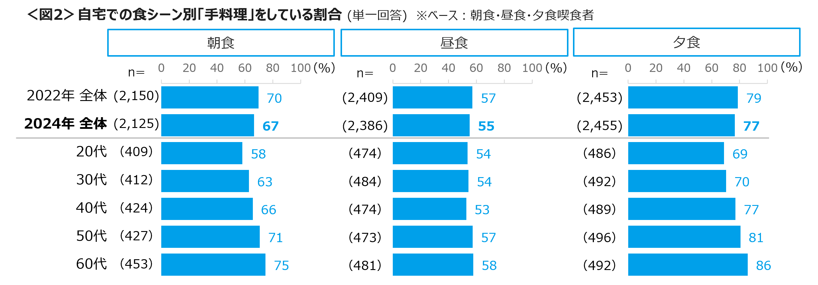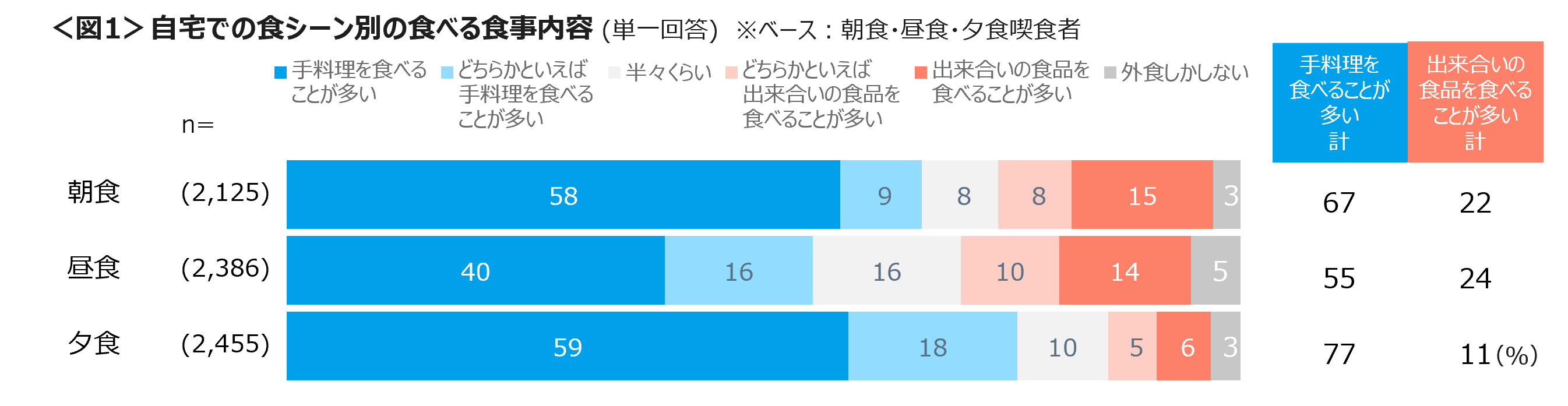自宅で食事をする際は、朝食、昼食、夕食ともに「手料理」をしている割合が高く、夕食は77%を占めた。手料理率は年代があがるほど高まる傾向にある。<図1,2>