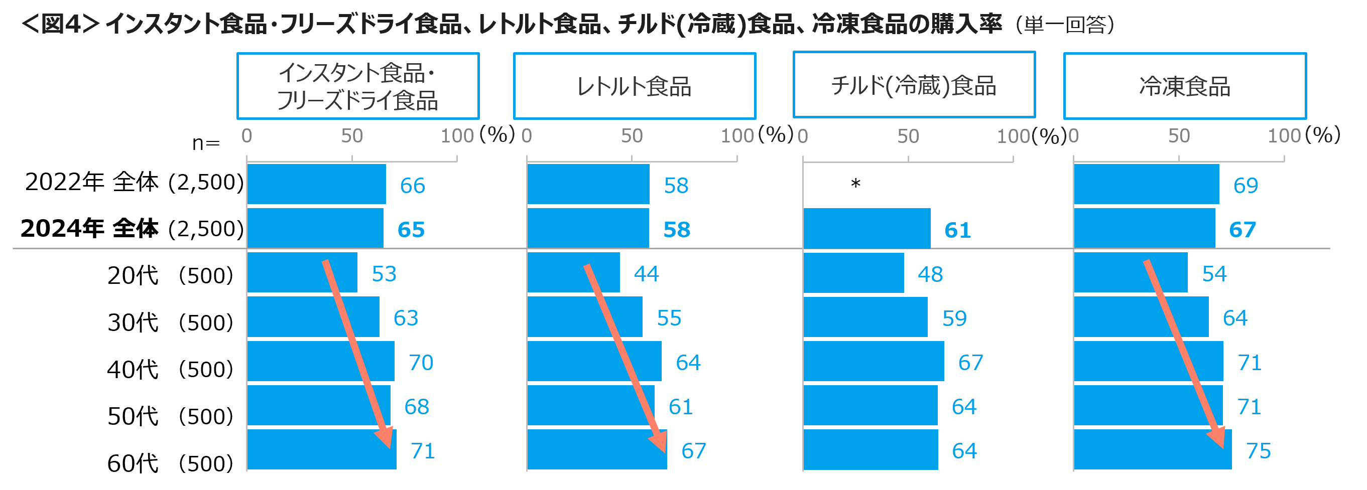 常温保管のできるインスタント・フリーズドライ食品、レトルト食品と冷蔵・冷凍保存が必要な食品の購入率は、「冷凍食品」67%、「インスタント・フリーズドライ食品」65%、「チルド(冷蔵)食品」61%、「レトルト食品」58%であった。20代はいずれも購入率が最も低く、特に「レトルト食品」「チルド食品」は、洗い物など一手間かかることからか5割に満たなかった。一方、40代は「レトルト食品」「チルド食品」の購入率が高い。<図4>