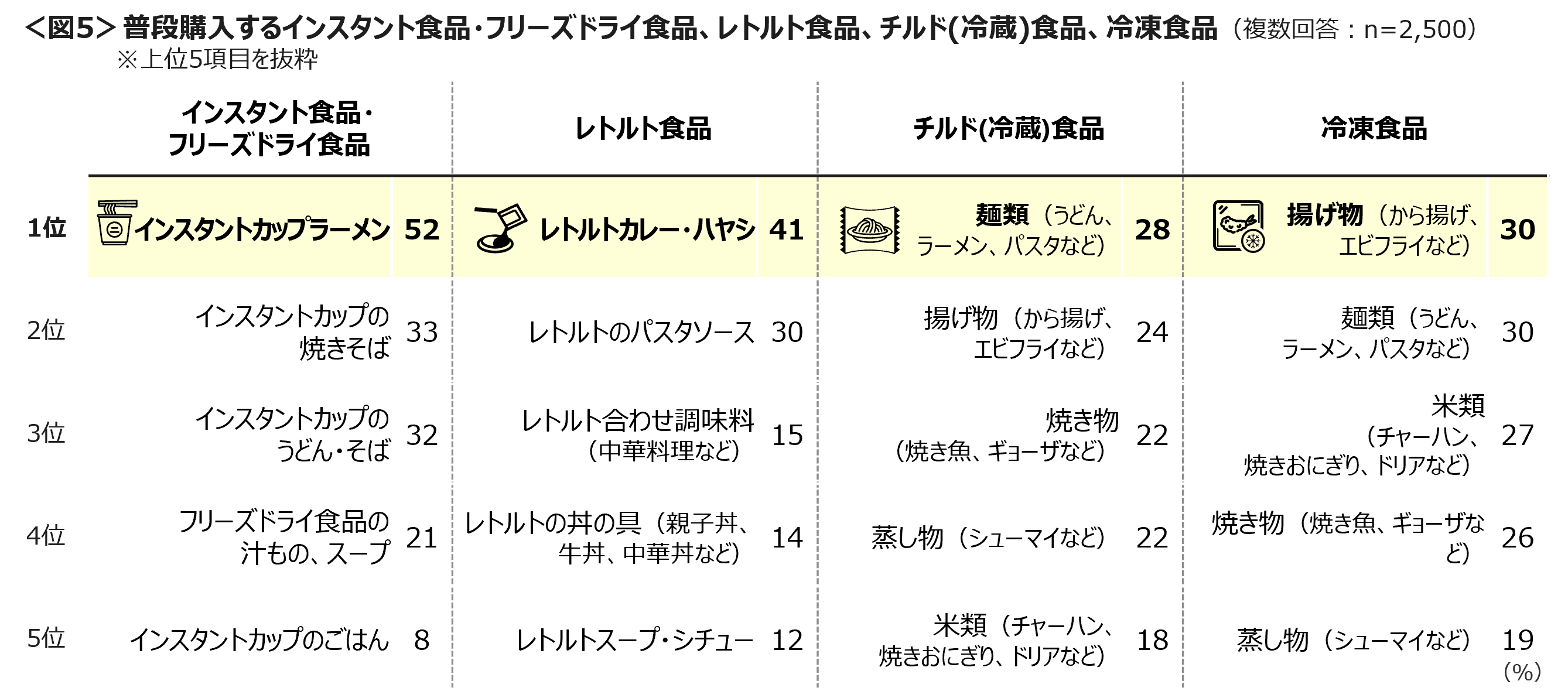 具体的な購入商品は、「インスタントカップラーメン」52%が最も多く、次いで「レトルトカレー・ハヤシ」41%、「インスタントカップの焼きそば」33%、「インスタントカップのうどん・そば」32%など、常温保管ができ賞味期限が長めのものがあがった。<図5>