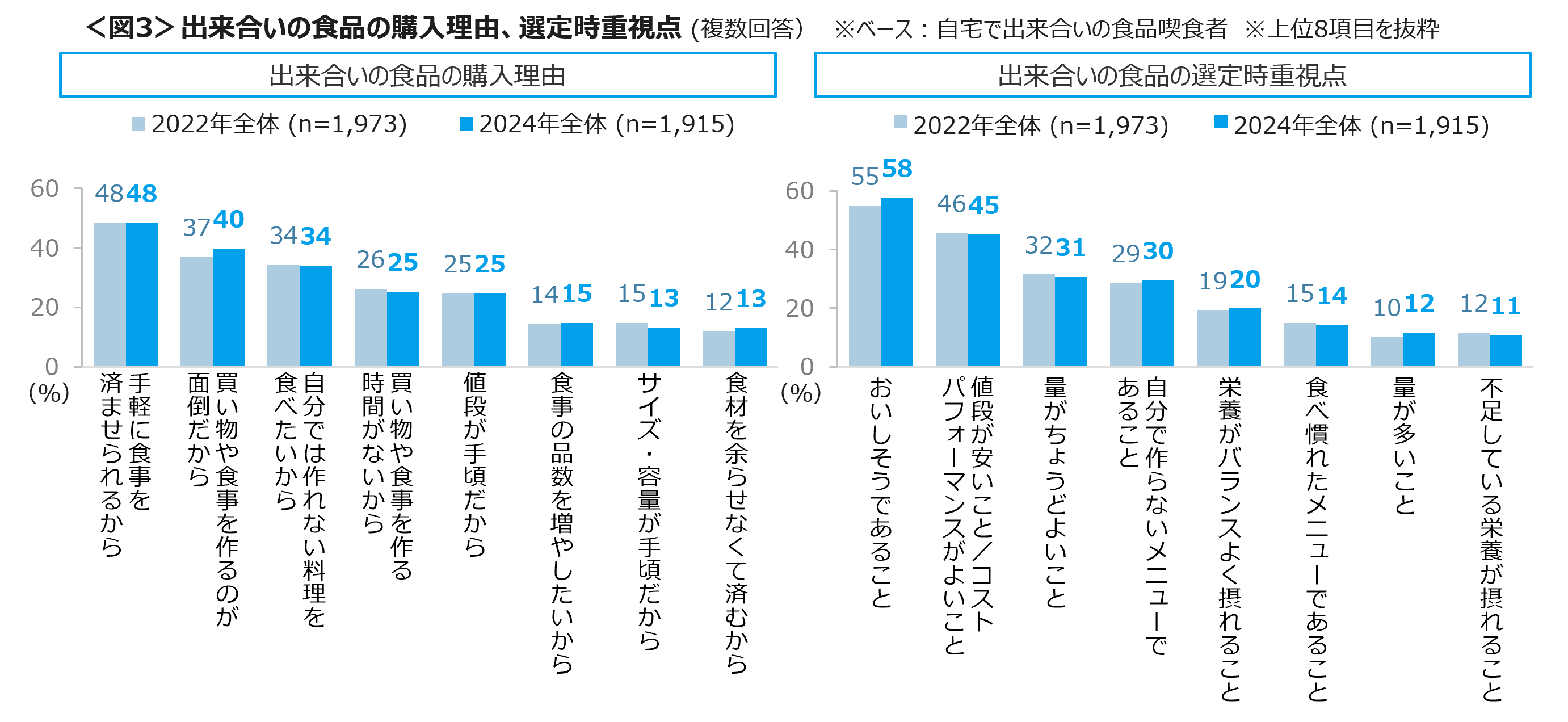 お総菜など出来合いの食品の購入理由は「手軽にすませたい」「買い物や食事作りが面倒」「自分では作れない料理を食べたい」、選定時重視点では「おいしそう」「値段が安い」「量がちょうどよい」がTOP3にあがる。コロナ禍の2022年より大きな変化は見られなかった。<図3>
