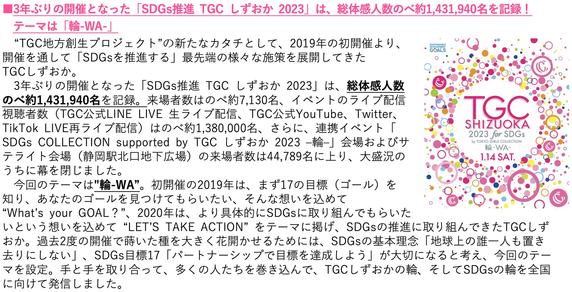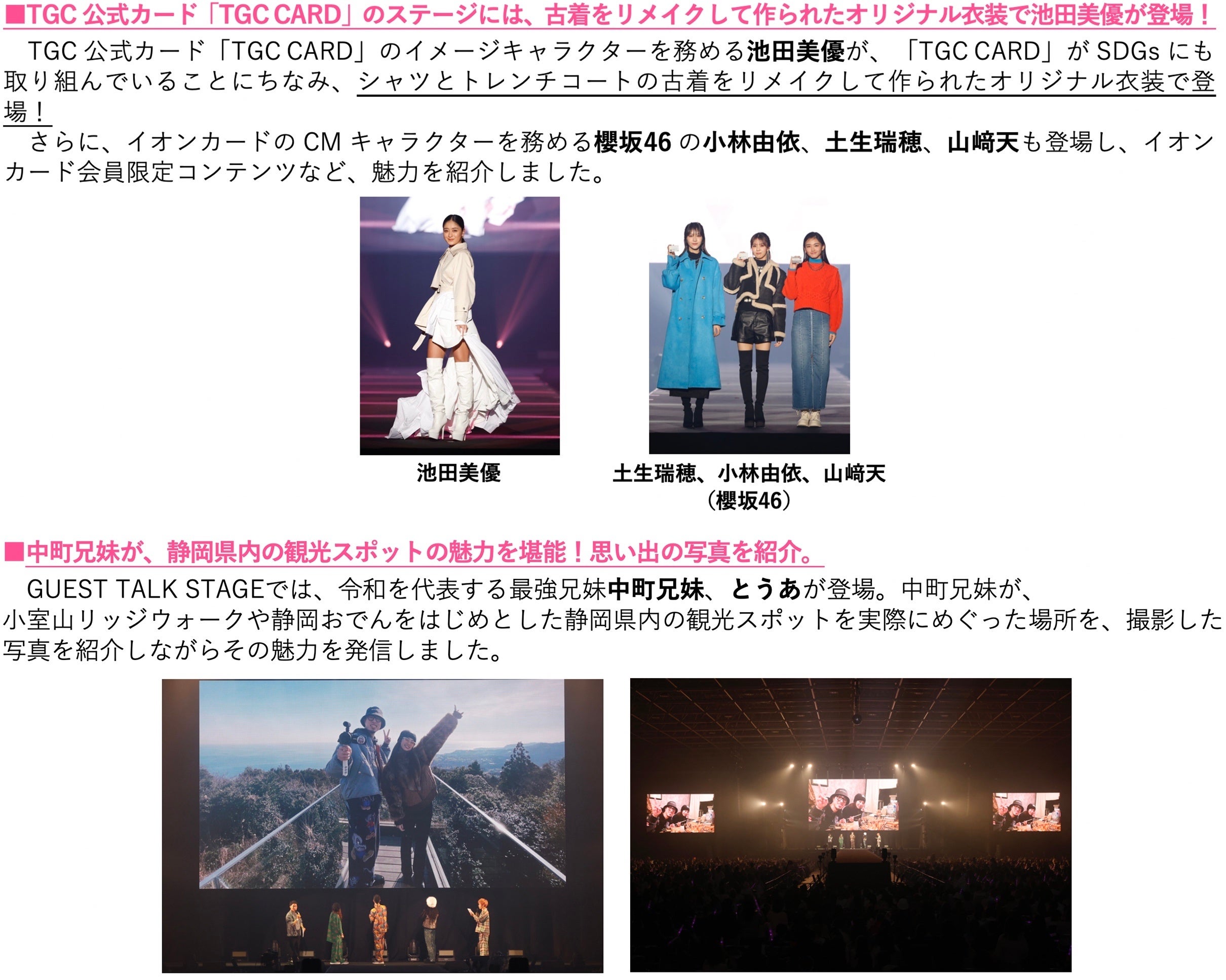 3年ぶりの「TGCしずおか」総体感人数はのべ約1,431,940名!全ファッションショーにSDGs目標を設定!楓、藤井夏恋、せいら、マギー、ゆうちゃみらが集結!板垣李光人、王林、山下幸輝らが初登場!