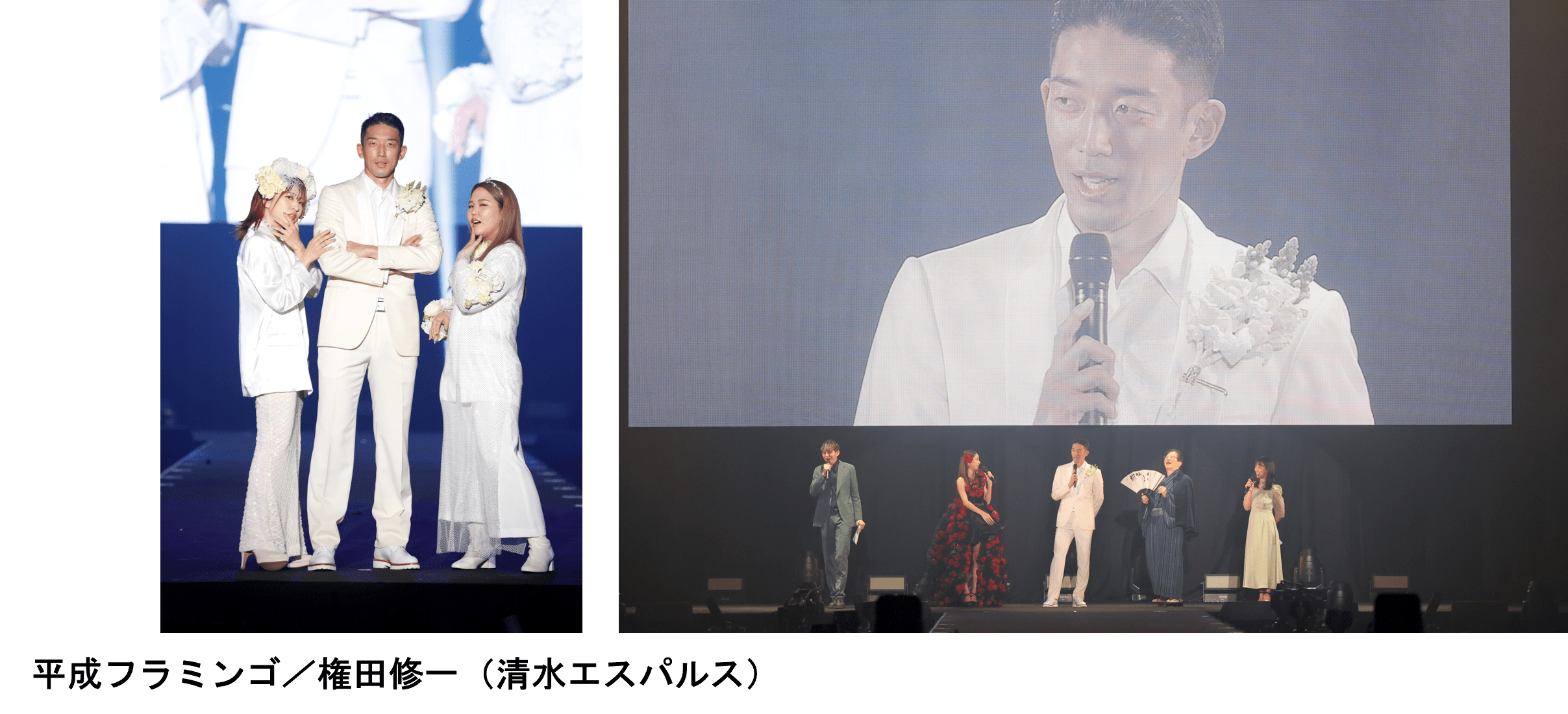 初ランウェイの感想を聞かれた権田選手は「初戦のドイツ戦よりも緊張しました。こんなに(ランウェイが)長いと思わなくて、本当に緊張しました。でも楽しかったです!(試合のときよりも)やり切ったという感覚です。」と初めての経験に、安堵の笑顔でコメントしました。ウォーキングについては過去のTGCの映像をみて準備したとのこと。一緒にランウェイを歩いた平成フラミンゴとは初共演ながらも、息の合ったポージングで3年ぶりのTGCしずおかを盛り上げました。観客に向けてコメントを求められると「TGC しずおか 2023 みなさん、ブラボーです!」とメッセージを送りました。